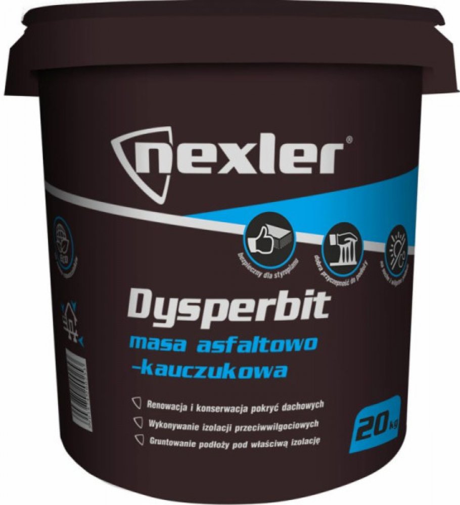 Značka - Nexler. Černá barva. Účel - K obnově živičných střešních krytin, k penetraci podkladu a k izolaci základů, k ochraně dřevotřískových desek, k utěsnění koupelen a WC. Pracovní teplota - +5 - +35°C. Vydatnost - 0,8 - 1,2 kg/m2 na vrstvu. Hmotnost - 20 kg.
