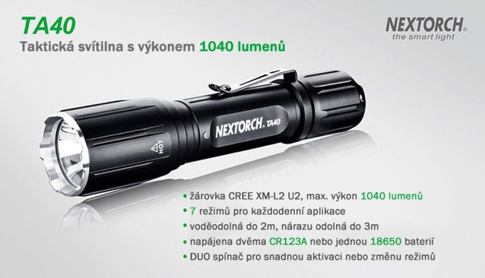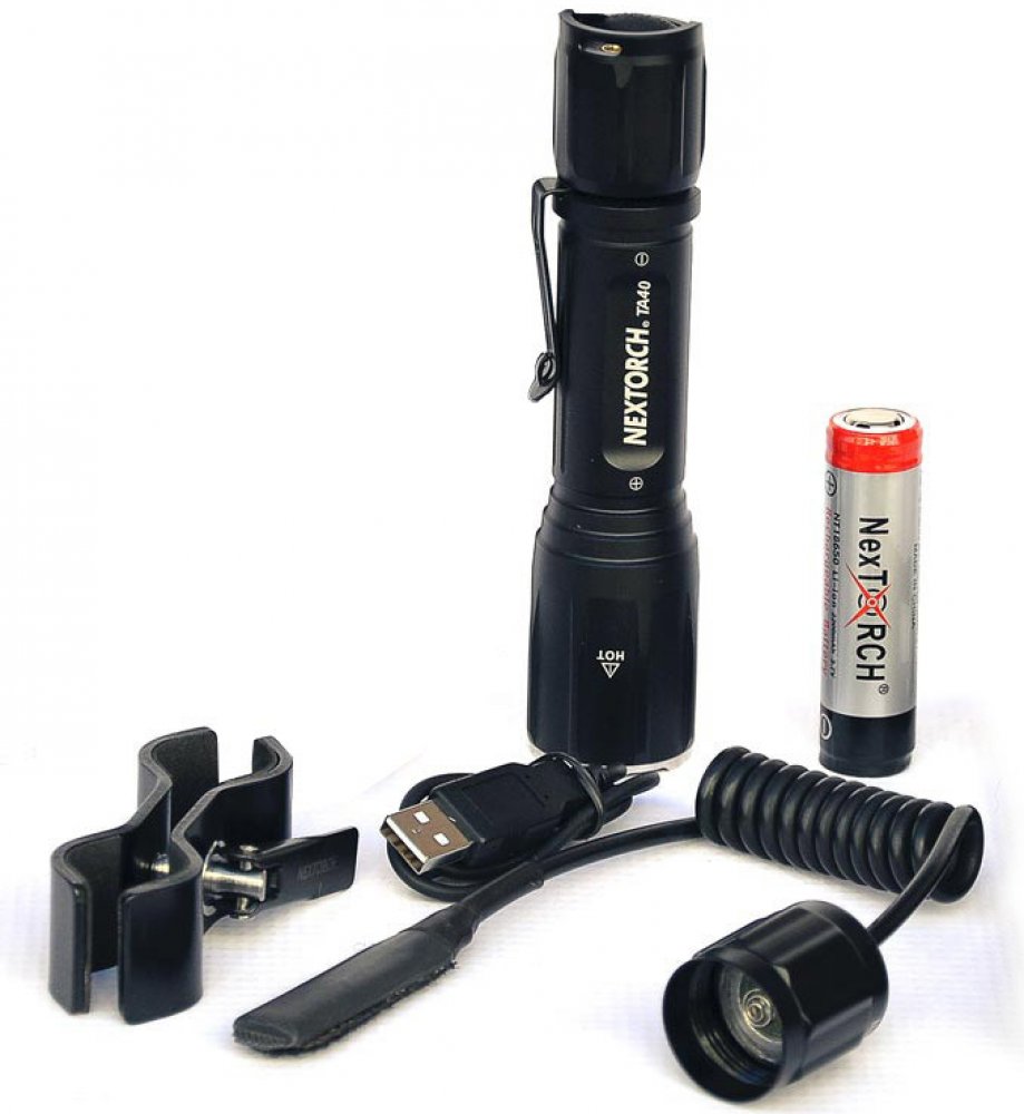 Taktická svítilna TA40 díky klipu pro připnutí na opasek, poutku či nylonovému pouzdru (vše je součásti balení) nabízí různé způsoby nošení a využití, vhodná je však také jako pomocník pro lov. Mezi volitelné příslušenství patří dálková spoušť a svítilna má odpovídající rozměry pro využití montáží NexTORCH, takže ji lze snadno použít také připevněnou na zbrani.