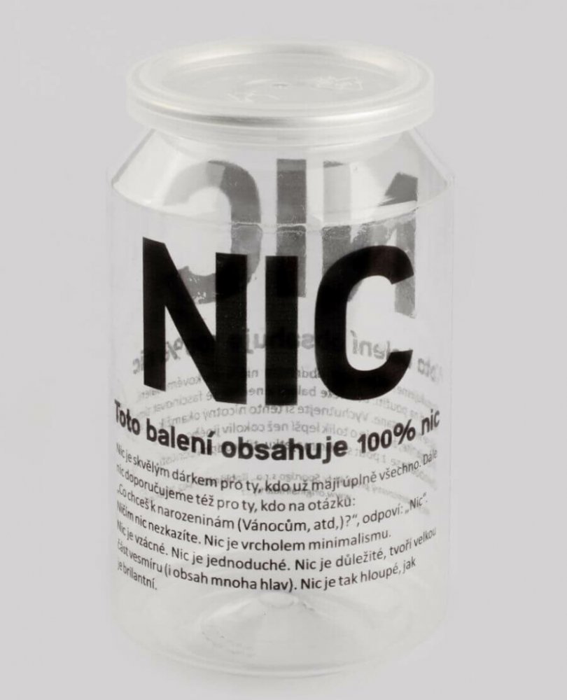 Dárkové balení NIC. Vtipný dárek pro ty, co mají smysl pro humor. Ostatním nedoporučujeme. Originální dárek pro ty, co mají úplně všechno. Určitě jste už někdy slyšeli na klasickou odpověď „nic“ na otázku, co máte koupit k narozeninám, k svátku, k vánocům. Co takhle NIC skutečně darovat? Dárkové balení NIC není úplně obvyklé, ale zaručeně pobaví. Z vlastní zkušenosti doporučujeme koupit ještě jeden hodnotný dárek do zálohy :_) Materiál: plast. Rozměry: 6,5cm x 11cm. Tvar v podstatě stejný, jako plechovka Coca Coly, jen plastová. Otevíratelná pouze jednou. Nahoře ještě plastové víčko. Dovnitř nelze nic umístit. Lze předat pouze jako NIC. Pozor: obsahuje skutečně nic. Nechceme nikoho napálit. Tento produkt se prodává jako vtipný dárkový předmět. Neobsahuje stabilizátory, emulgátory, ani barviva. Pokud nemáte smysl pro humor, nekupujte ho.