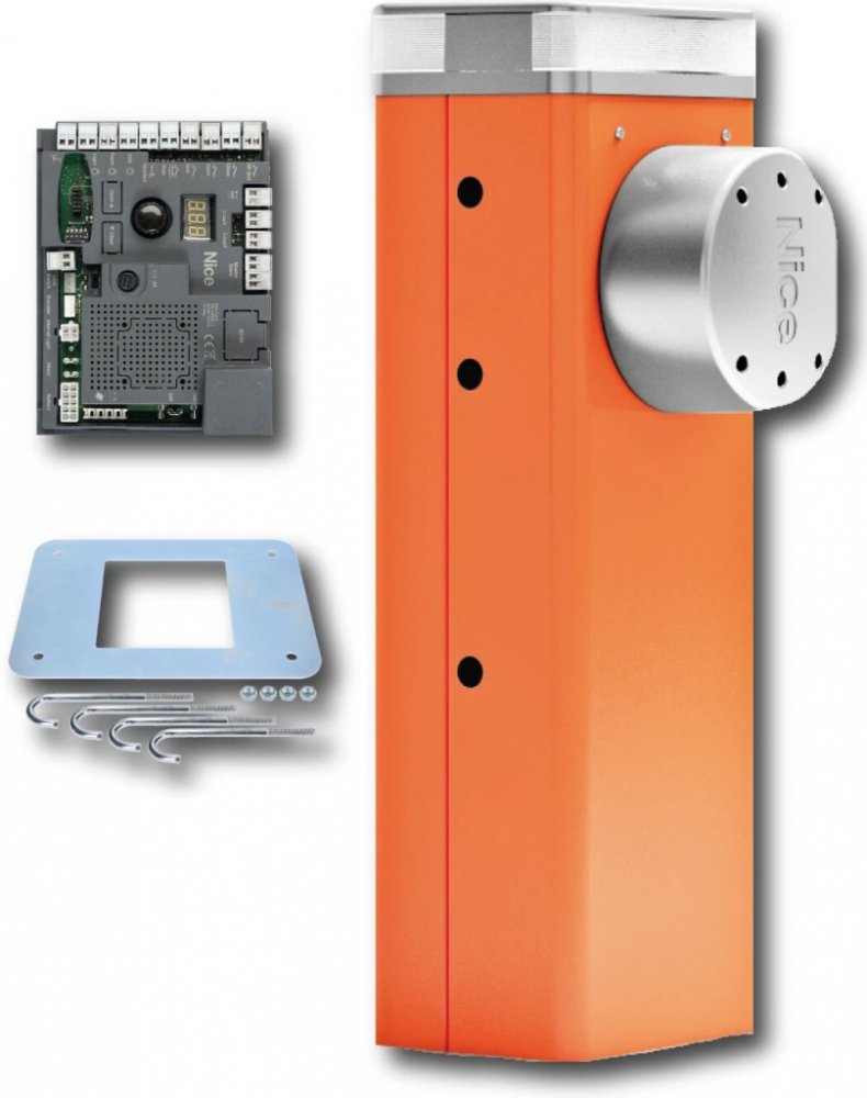 1ks závory - pohon - kryt vyroben z odolné oceli s ochranným nátěrem a oranžovou barvou (lze zakoupit i variantu s krytem v nerezové oceli) 1ks montážní kotevní desky 1ks řídící jednotky XBA3