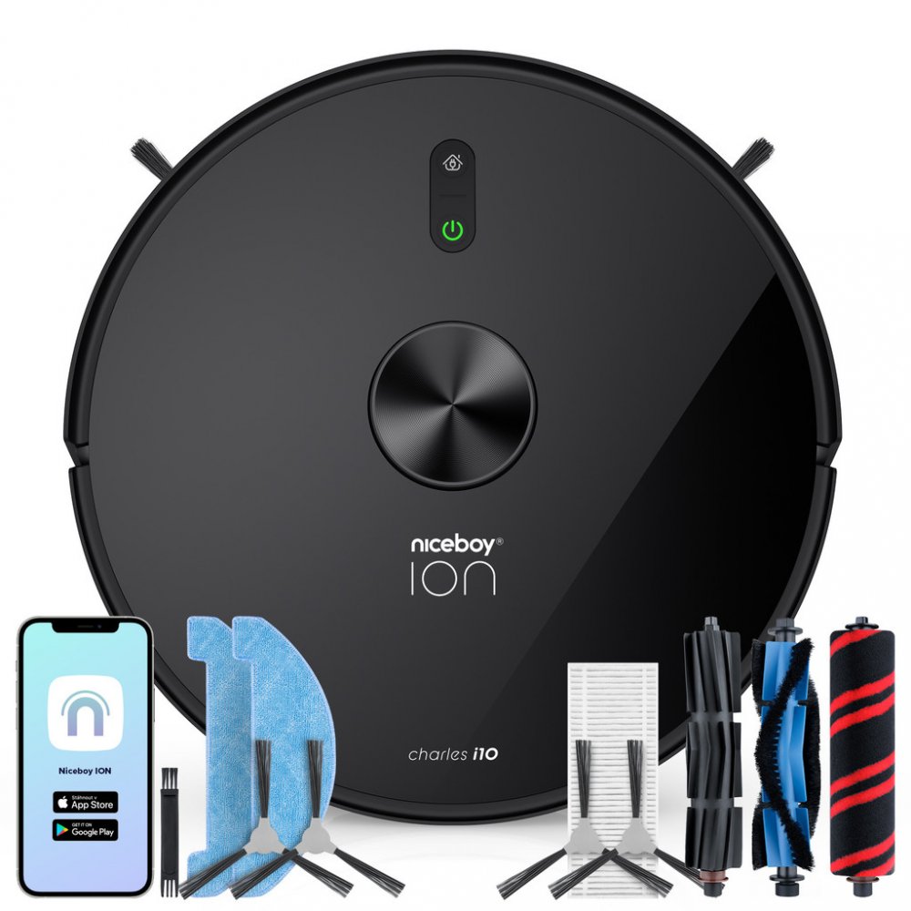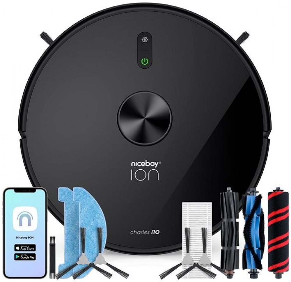 Stáhněte si do svého mobilního telefonu aplikaci Niceboy ION (přístupná v češtině, slovenštině, angličtině a dalších jazycích). Snadno si v ní naplánujete úklid, nastavíte režimy čištění a sledujete průběh úklidu, ať jste doma, na návštěvě nebo v zaměstnání. Kromě vysavače v aplikaci spravujete i ostatní chytré spotřebiče Niceboy ION, které vlastníte. Kromě toho vysavač podporuje hlasového asistenta Google Assistant.