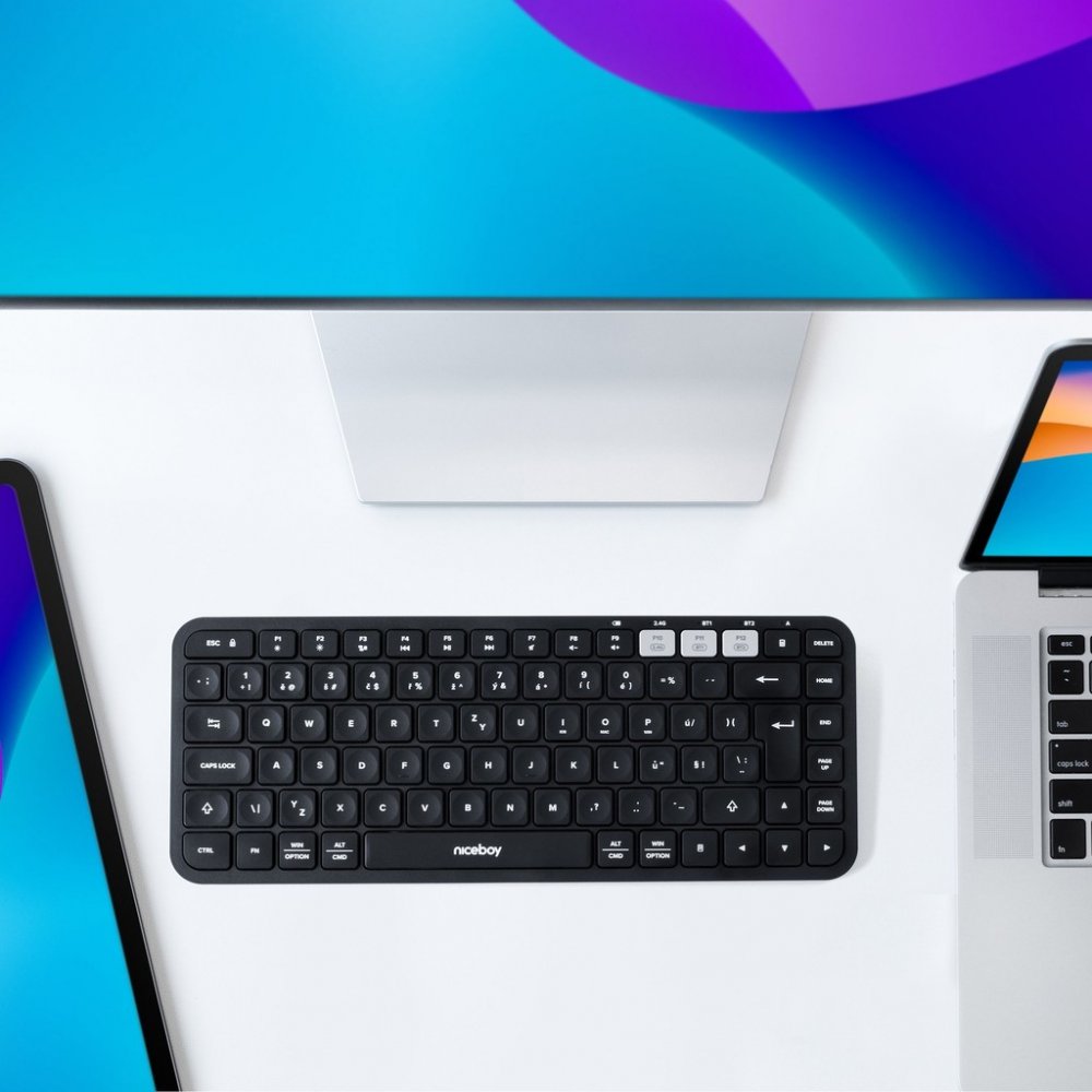 Ke klávesnici Niceboy připojíte až 3 zařízení najednou pomocí Bluetooth nebo přes miniaturní USB přijímač (ten je součástí balení). Díky funkci Plug & Play klávesnici jen zapojíte a hned používáte, aniž byste museli cokoliv instalovat. Její používání je tedy velmi lehké a naučíte se ho během chvilky. Pro přepínání mezi zařízeními využijete k tomu určené klávesy. Při nečinnosti přejde klávesnice do úsporného režimu, čímž šetří energii.