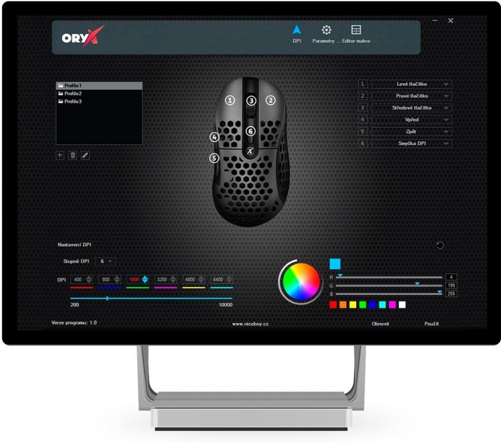 Vlastní software v českém jazyce vám umožní rychle a kompletně nastavovat makra, podsvícení a funkce všech šesti tlačítek.