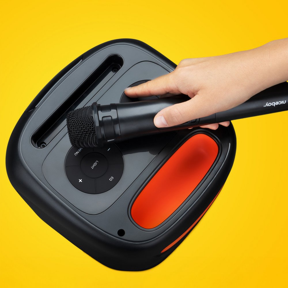 Užívejte si ještě více zábavy s Niceboy PARTY Boom 80W! S bezdrátovým mikrofonem a dvěma 6,3 mm jack konektory pro připojení dalších nástrojů umí tento reproduktor více než jen přehrávání hudby. Připojte se s přáteli, odhalte svůj talent a udělejte si vlastní hudební show! Ty nejlepší momenty si nahrajte na microSD kartu nebo USB disk a vytvářejte tak nezapomenutelné okamžiky. Svět hudby s Niceboy PARTY Boom 80W, to je vaše vlastní pódium, vaše vlastní zábava!
