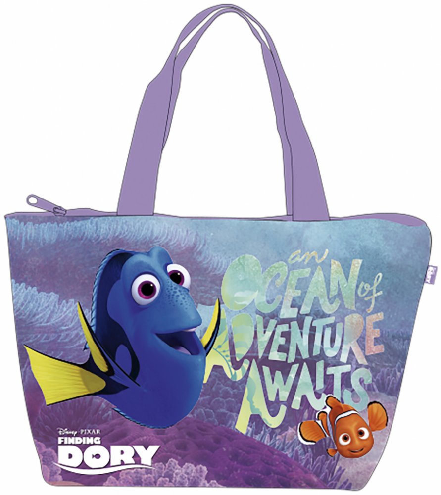 Dětská plážová taška Hledá se Dory je vyrobena z kvalitního pevného materiálu. Tato fialová plážová taška s motivem rybičky Dory z oblíbené pohádky jistě potěší především holky. Má jeden hlavní úložný prostor se zapínáním na zip. Barevný motiv rybičky Dory je z jedné strany. Z druhé strany je taška fialová. Taška má dlouhé uši, takže ji lze nosit v ruce nebo pohodlně přes rameno. Skvělá nejen k vo...