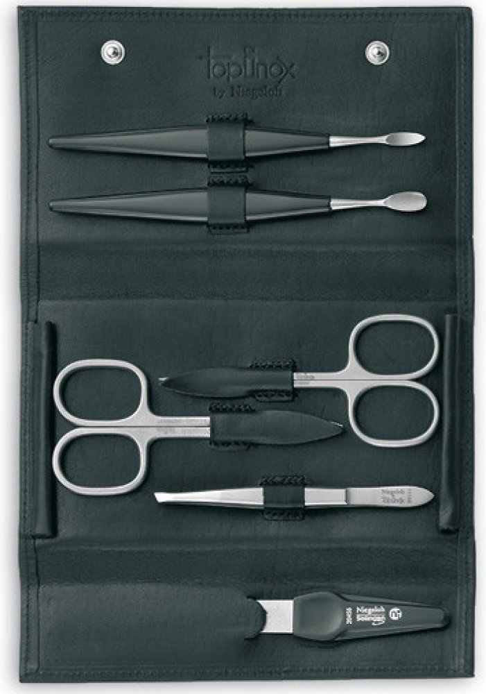 6-dílná luxusní pánská manikúraNástroje topInox ® kovaná nerezová ocel - matné provedeníPouzdro černé barvy z měkké kůže Jednoduché zavírání na patentkySada obsahuje: manikúrní nůžky na nehty, manikúrní nůžky na kůžičku, safírový pilník na nehty, pinzetu, manikúrový nástroj "tlačka", manikúrový nástroj "špička"
