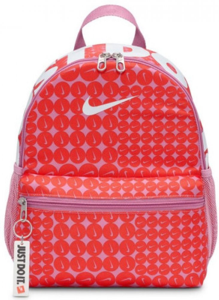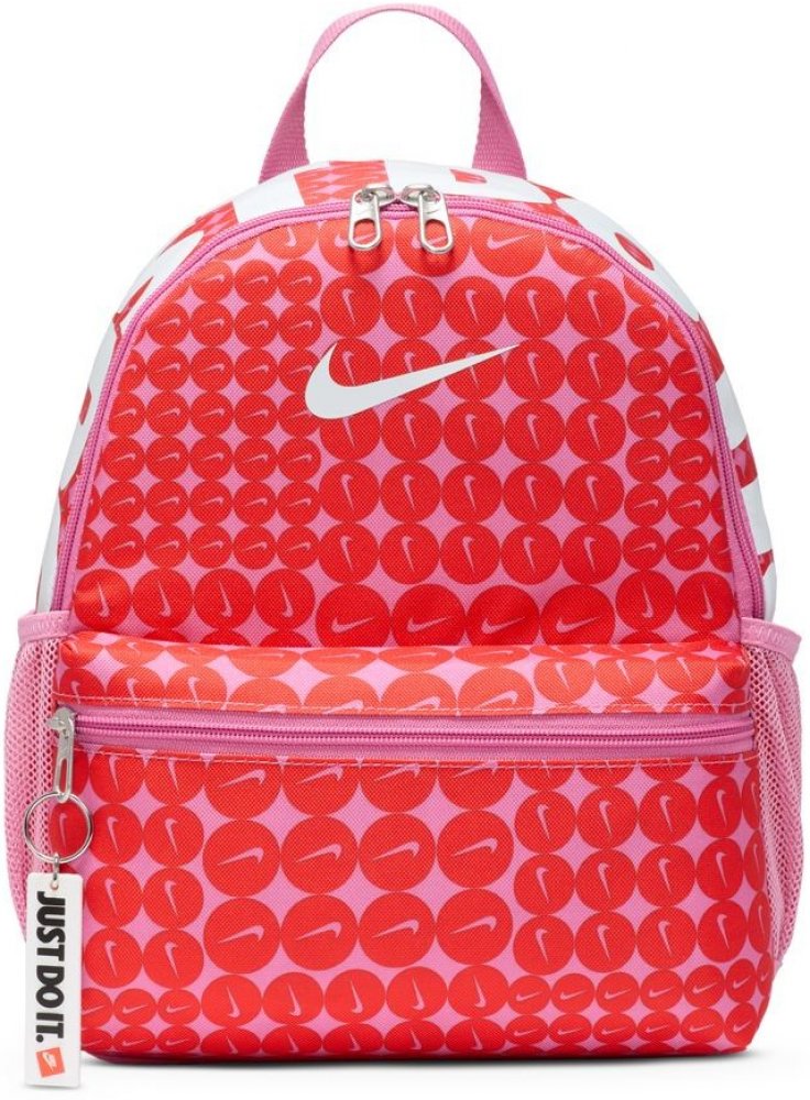 Dětský batoh Nike. Pro dívky, tento pestrý batoh vyniká moderním designem. Celoplošný potisk v červeno-růžovém tónu zvýrazní jakýkoliv dívčí outfit, s nápisem JUST DO IT kolem dokola. Výroba z odolného materiálu zaručuje jeho dlouhou životnost. Ideální pro běžné nošení nebo krátké výlety s přáteli.