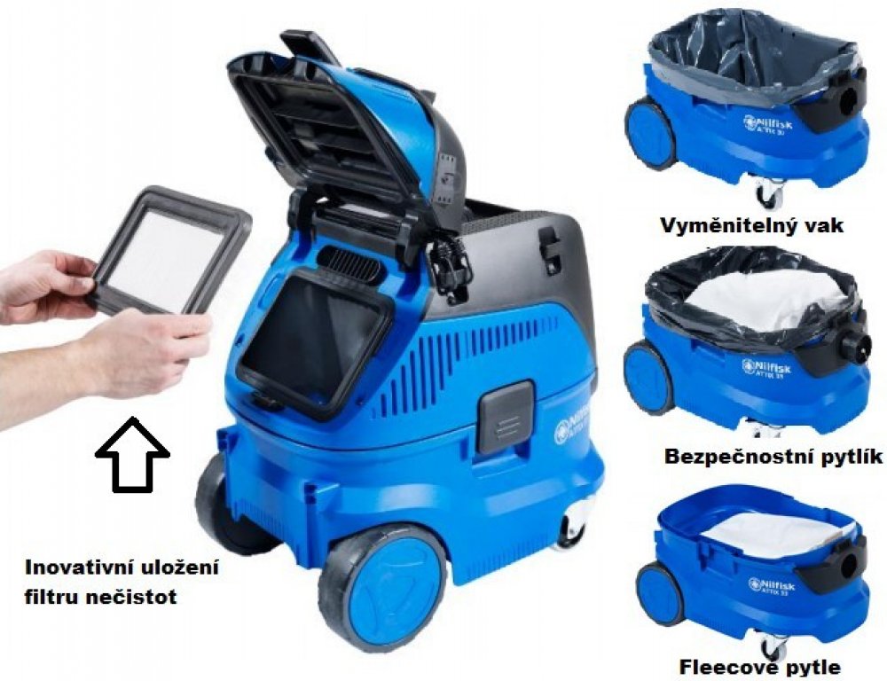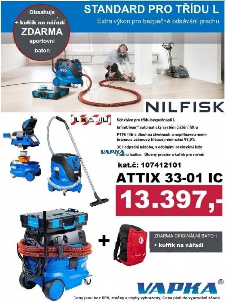 NILFISK ATTIX 33-01 IC - VYSAVAČ S inovativním NOVÝM AUTOMATICKÝM systémem čištění filtru, zvýšeným výkonem a robustním designem reprezentuje tato třída výjimečné řešení pro profesionální úklid bezpečným a odolným strojem. ATTIX 33 přináší vyšší sací výkon, prachotěsný systém filtrace s automatickým čištěním a mnoho dalších benefitů, zkonstruovaných pro pokrytí požadavků ve stavebnictví i dalších ...