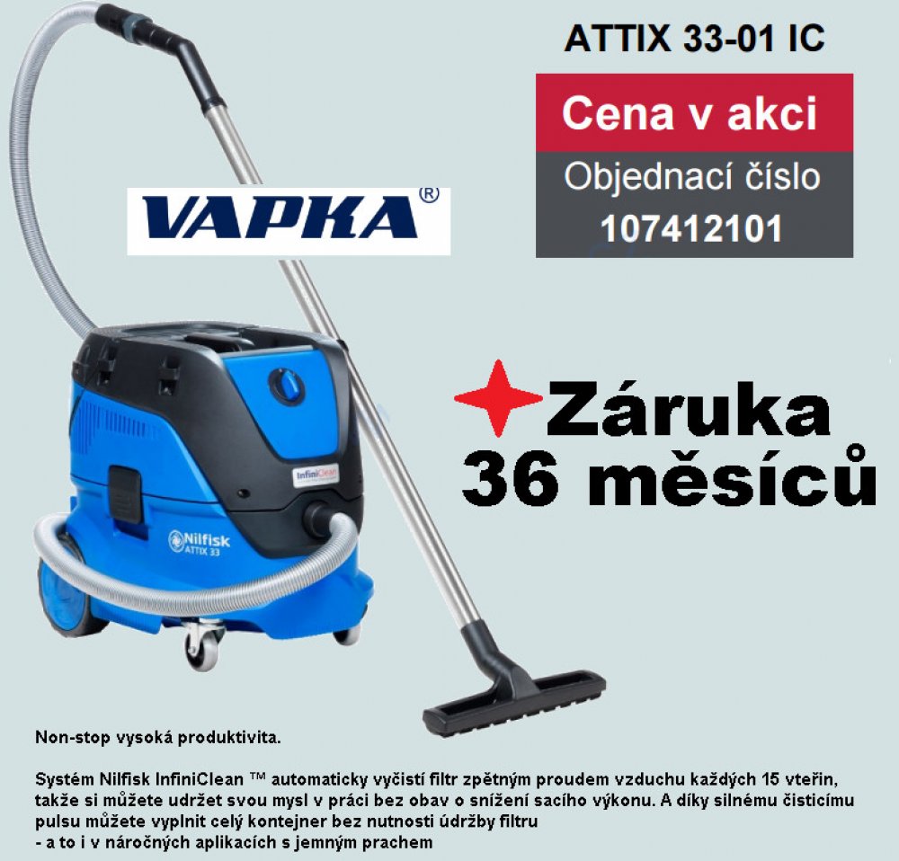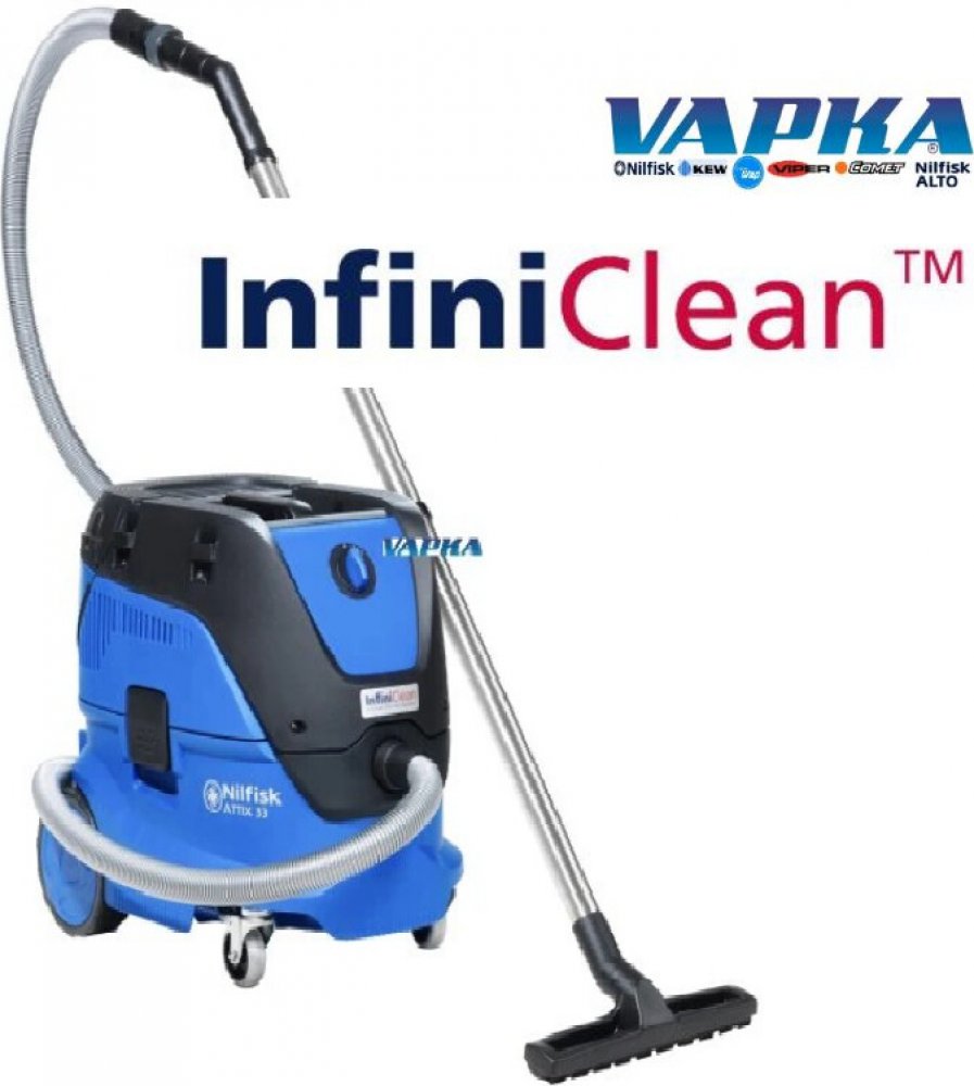 Vysavač ATTIX 33 nabízí pozoruhodnou úroveň produktivity díky systému automatického čištění filtru InfiniClean™. Tento systém zajišťuje pomocí reverzních pulzů vzduchu nepřetržité čištění filtru během použití a udržuje tak sací výkon na vysoké úrovni.