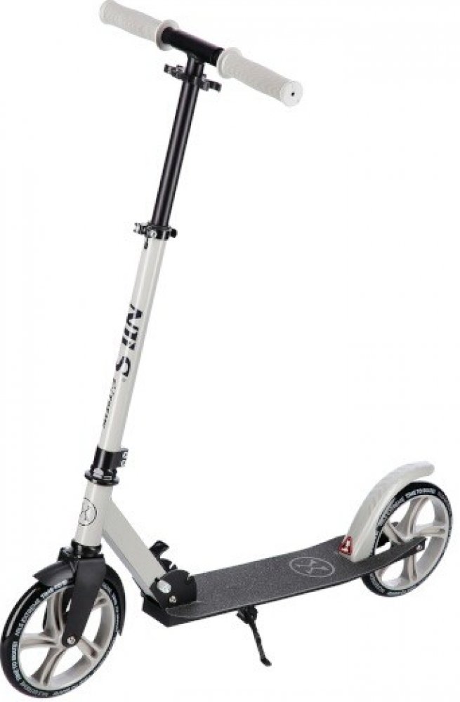 Zadní blatník slouží jako přítlačná brzda. Rídítka je možné při skládání sklopit a pro maximální pohodlí během jízdy jsou opatřena gumovými rukojeťmi. Výšku řídítek lze nastavit do 3 úrovní v rozsahu od 75 do 95 cm.