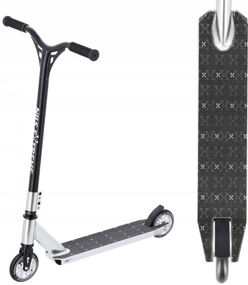 NILS Extreme HS107 je freestyle koloběžka s nosností 100 kg a je tak vhodná jak pro děti, tak pro dospělé. Konstrukce je vyrobena ze silné a trvanlivé oceli. Model HS107 je vhodný na asfalt a dlažbu. Kolečka o rozměru 110 x 24 mm mají hliníkový střed a jsou osazeny ložisky ABEC 9, bezpečnost zaručuje zadní přítlačná (blatník) brzda. NILS Extreme HS107 je díky malým, rychlým kolečkům, robustní, pevné kostrukci a řídítkům protáčejícím se o 360° určena k provádění triků.