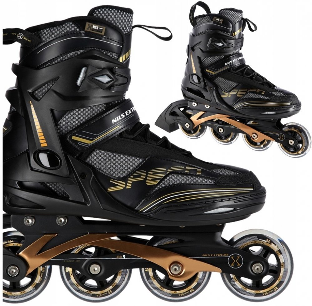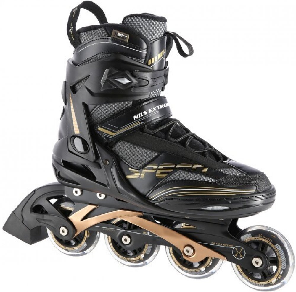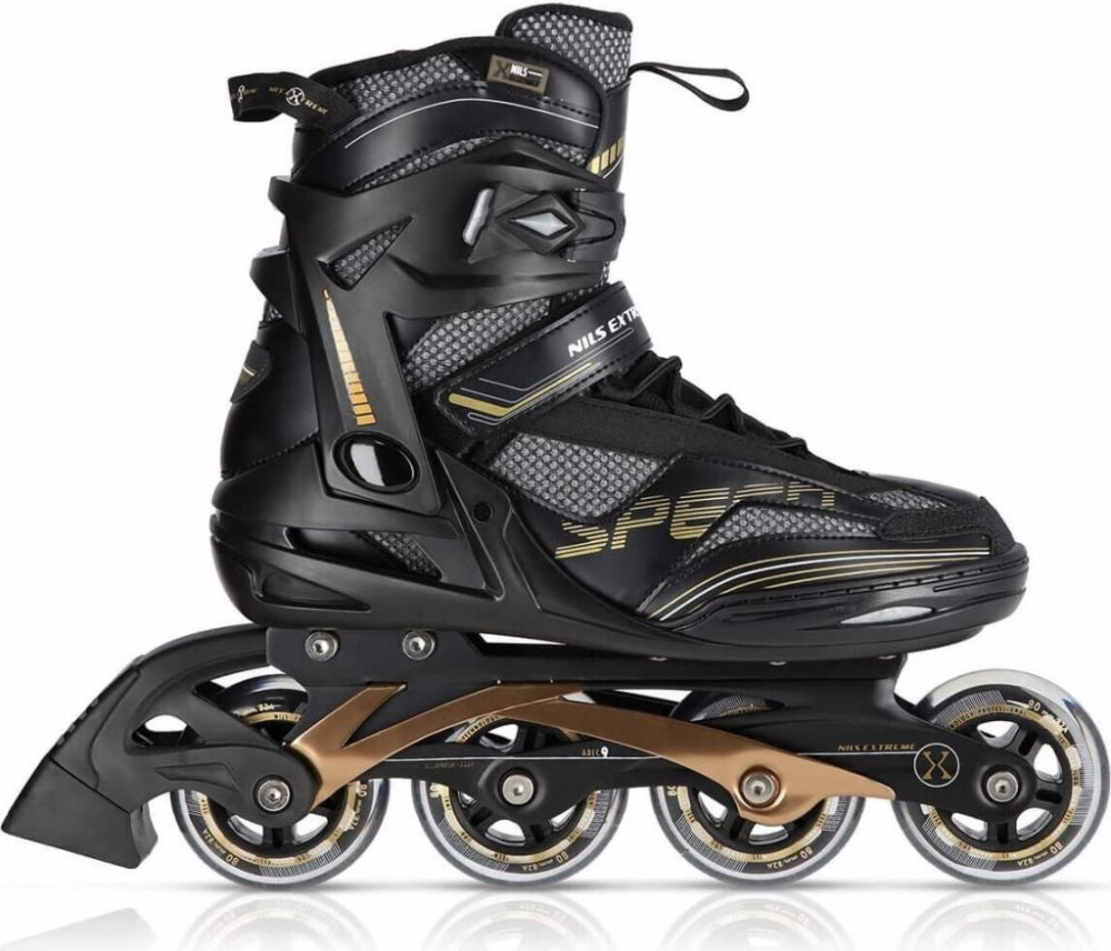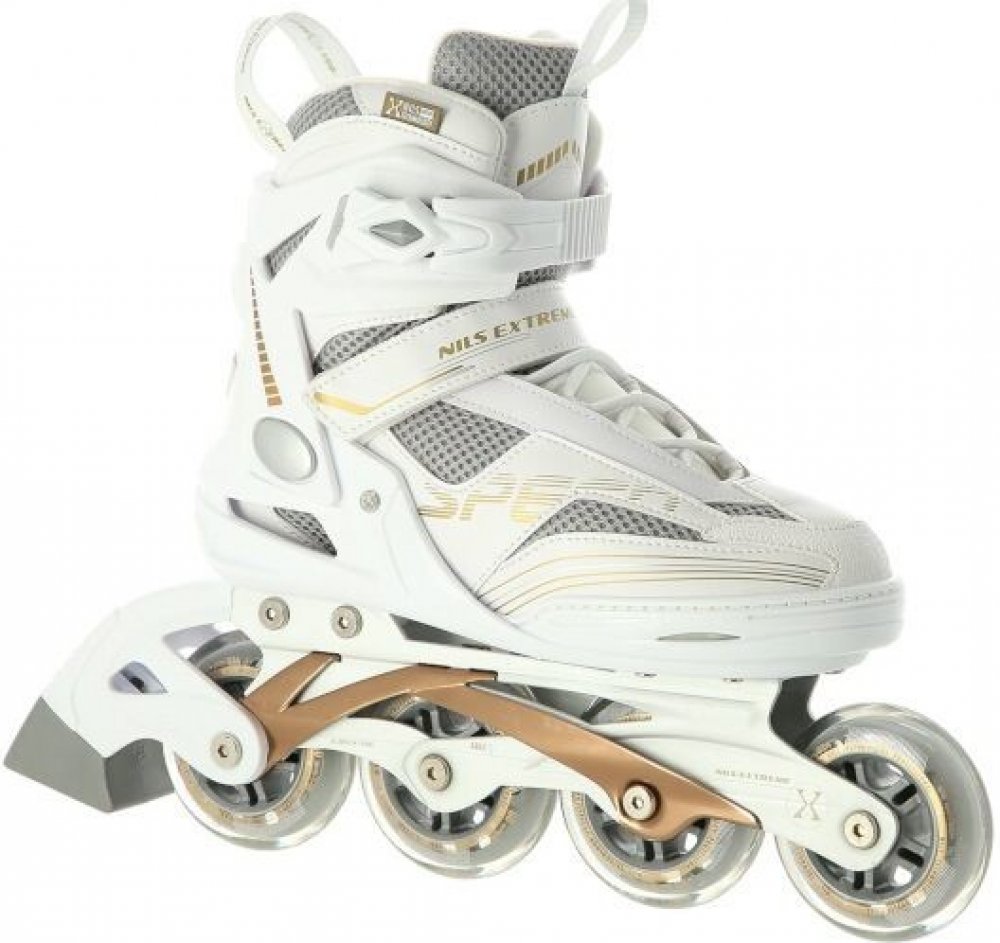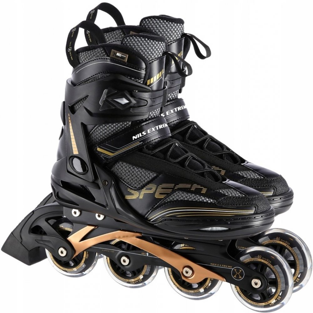 Kolečkové brusle NILS Extreme NA2150 jsou určeny k rekreační jízdě středně pokročilých a pokročilých bruslařů po rovných a hladkých stezkách, jako například po asfaltu. Lehká a odolná bota je vyrobena z kombinace síťoviny MESH a pěny EVA, špička je vybavena ventilačními otvory, tyto vlastnosti zaručují prodyšnost boty, snižují pocení nohy a předchází tak vlhnutí vložky. Systém ventilace a tvarovaná stélka boty tak přímo ovlivňují zvýšení uživatelského komfortu. Sketel modelu NH2150 je vyroben z polypropylenu, který je velice odolný a vydrží i ty nejtvrdší pády, zároveň stabilizuje chodidlo v oblasti kotníku. Bezpečnost brusle zvyšuje zapínání na dvousekční přezku, řeminek se suchým zipem a šněrování. 80-ti milimetrová kolečka s tvrdostí 82A jsou uložena v hliníkové liště vyrobené precizní CNC technologií, dobře přiléhají k podkladu a částečně pohlcují nervnosti. Model NA2150 je osazen ložisky ABEC 9 CHROME, která se vyznačují nízkým odporem, kdy jízda má dobrou setrvačnost a na bruslích tak lze dosáhnout vysoké rychlosti, nebo urazit delší vzdálenost bez vynaložení zbytečné síly.