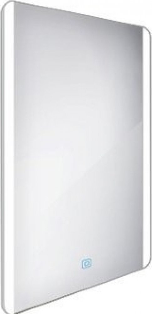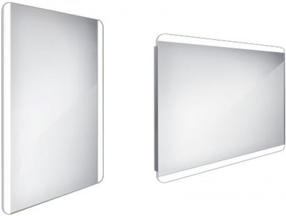 Obdélníkové bezrámové zrcadlo s oblými rohy a podsvícením ze stran pro moderní a elegantní vzhled.
