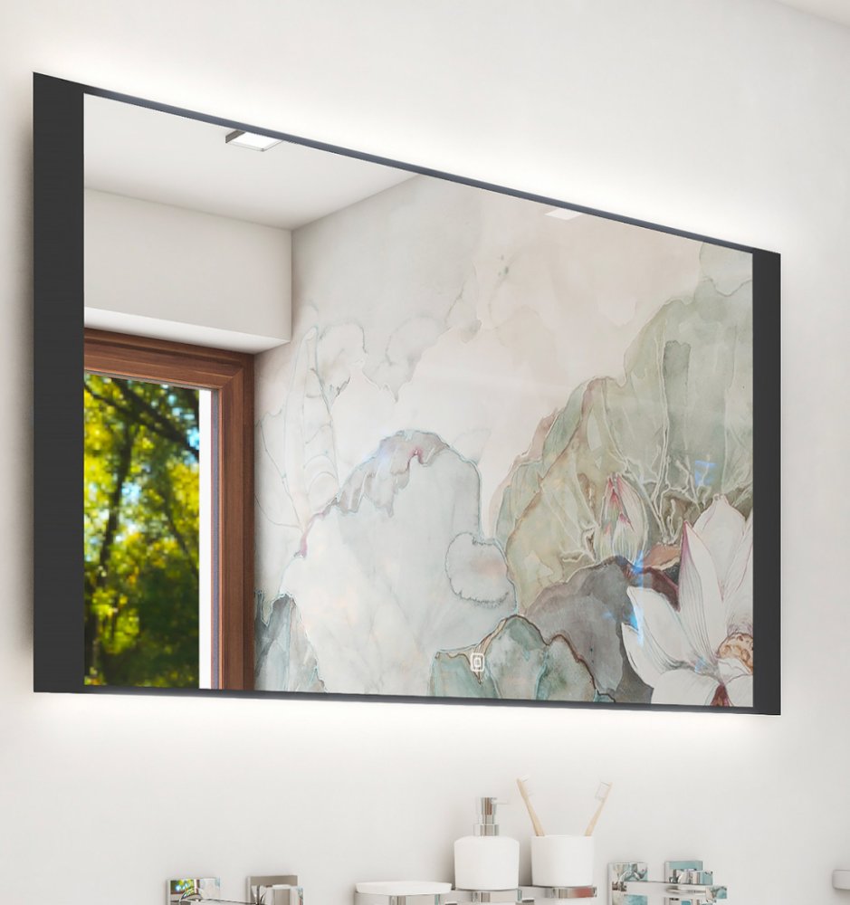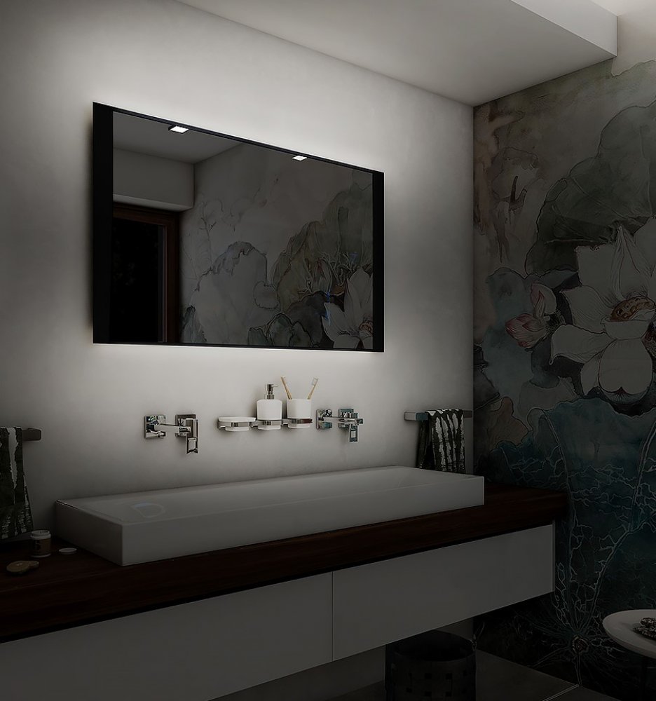 Obdélníkové zrcadlo s rámem s ostrými rohy a podsvícením ze spodu a shora pro rovnoměrné a stylové osvětlení.