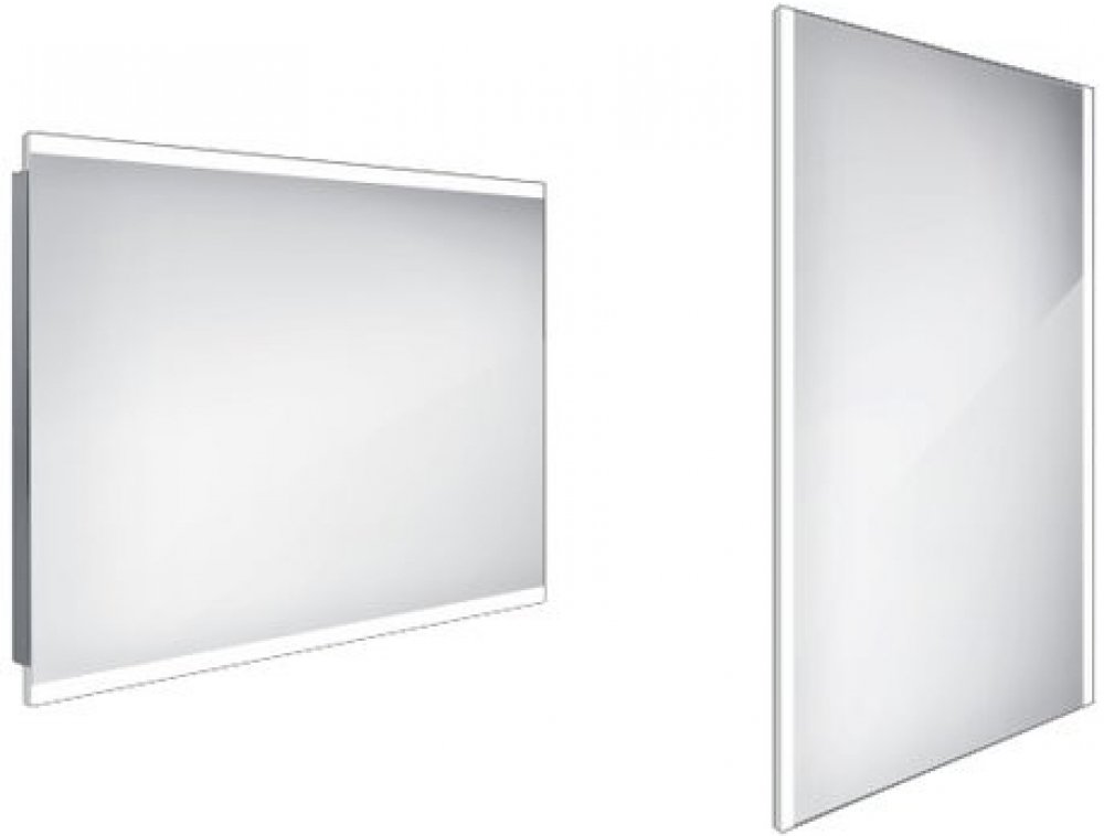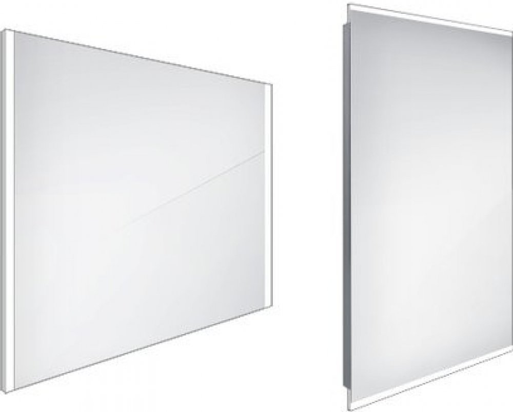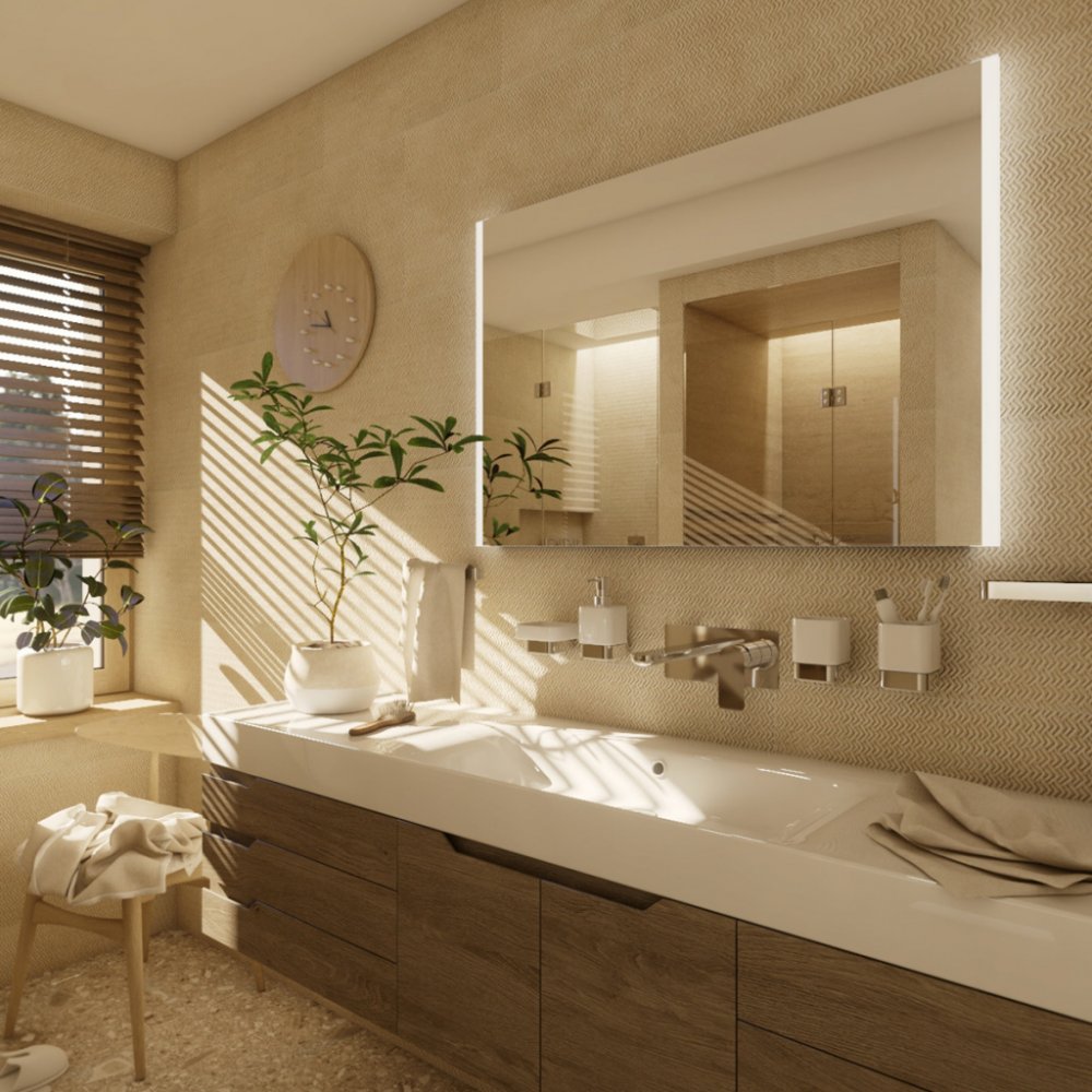 Obdélníkové bezrámové zrcadlo s ostrými rohy a podsvícením ze stran pro moderní a elegantní vzhled.