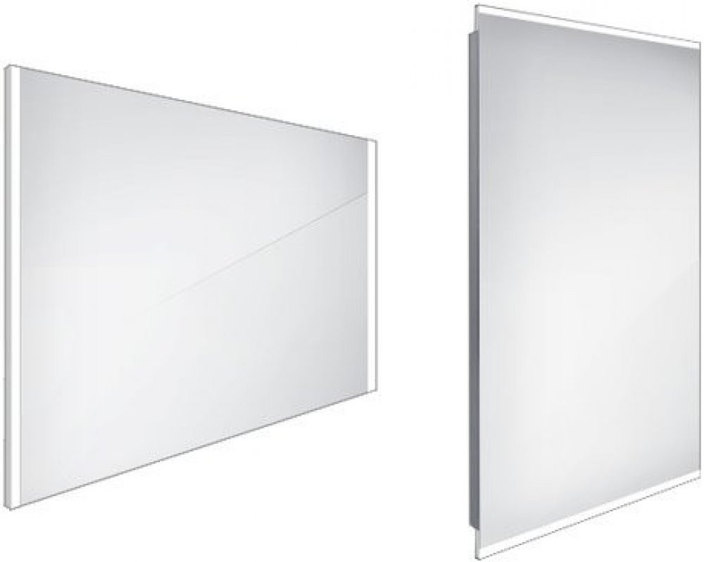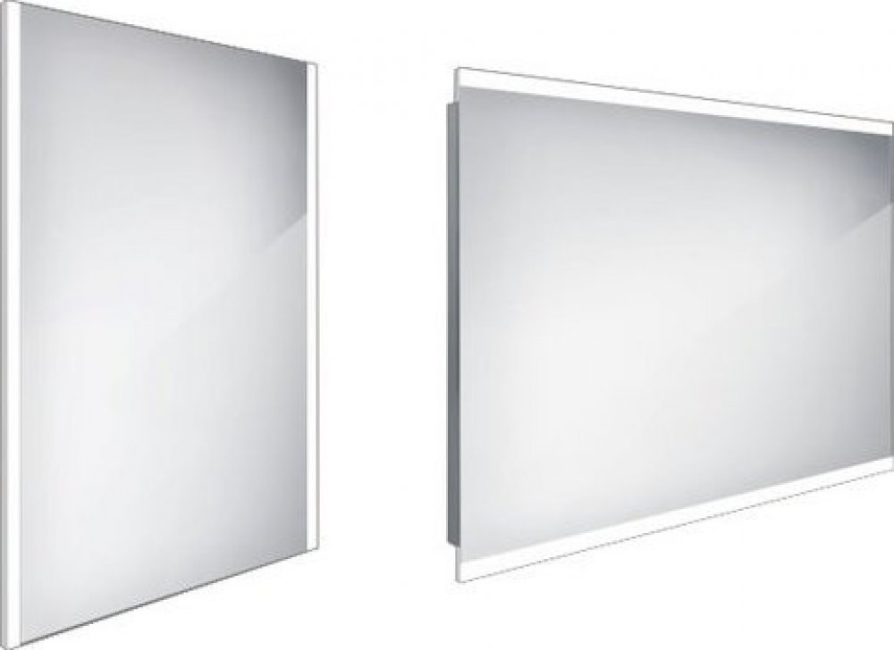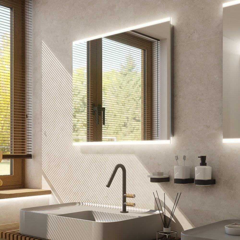 Obdélníkové bezrámové zrcadlo s ostrými rohy a podsvícením ze stran pro moderní a elegantní vzhled.