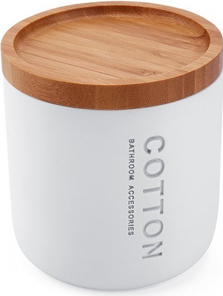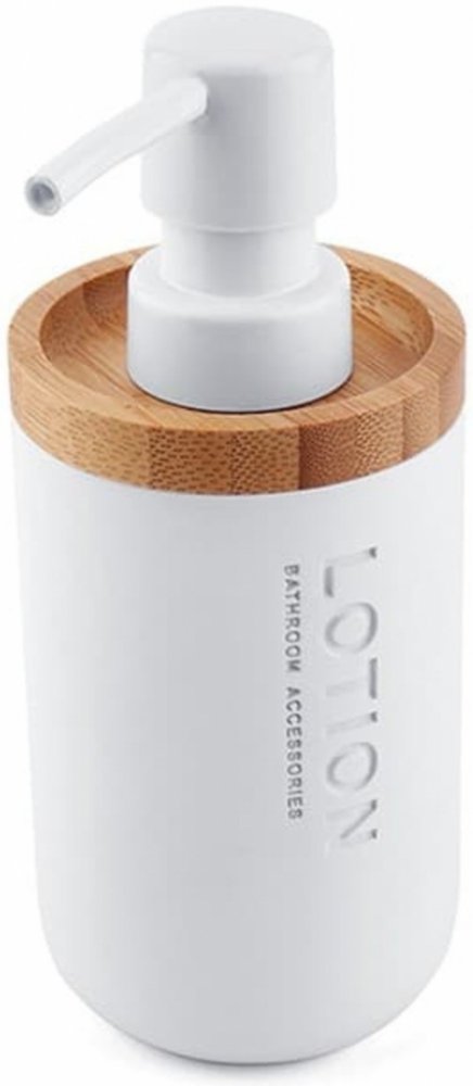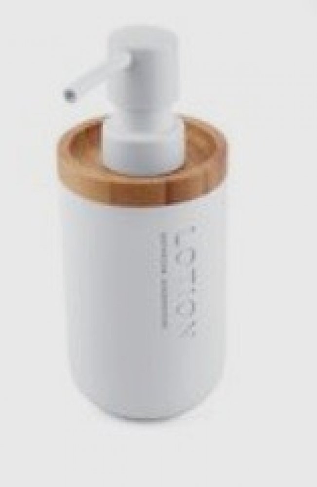 Dávkovač na tekuté mýdlo. Barva bílá. Materiál polyresin, bambusové dřevo. Obsah dávkovače 270 ml.