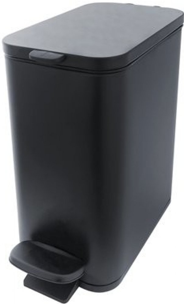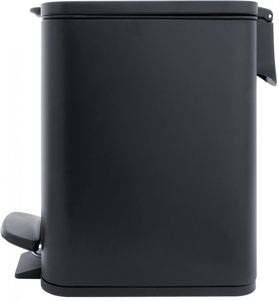 Matný černý odpadkový koš s nášlapem 11005-90 a vyjímatelnou nádobou o objemu 5l má oblé hrany a obdélníkový tvar víka. Díky užší čelní a delším bočním stranám je skvělým doplňkem vedle WC, kde je zhoršený přístup. Víko má na čelní straně navíc malý úchyt pro komfortnější otevírání rukou, které se hodí, když zrovna sedíte na WC. Měkké dovírání soft close zajišťuje tiché uzavření koše po uvolnění p...