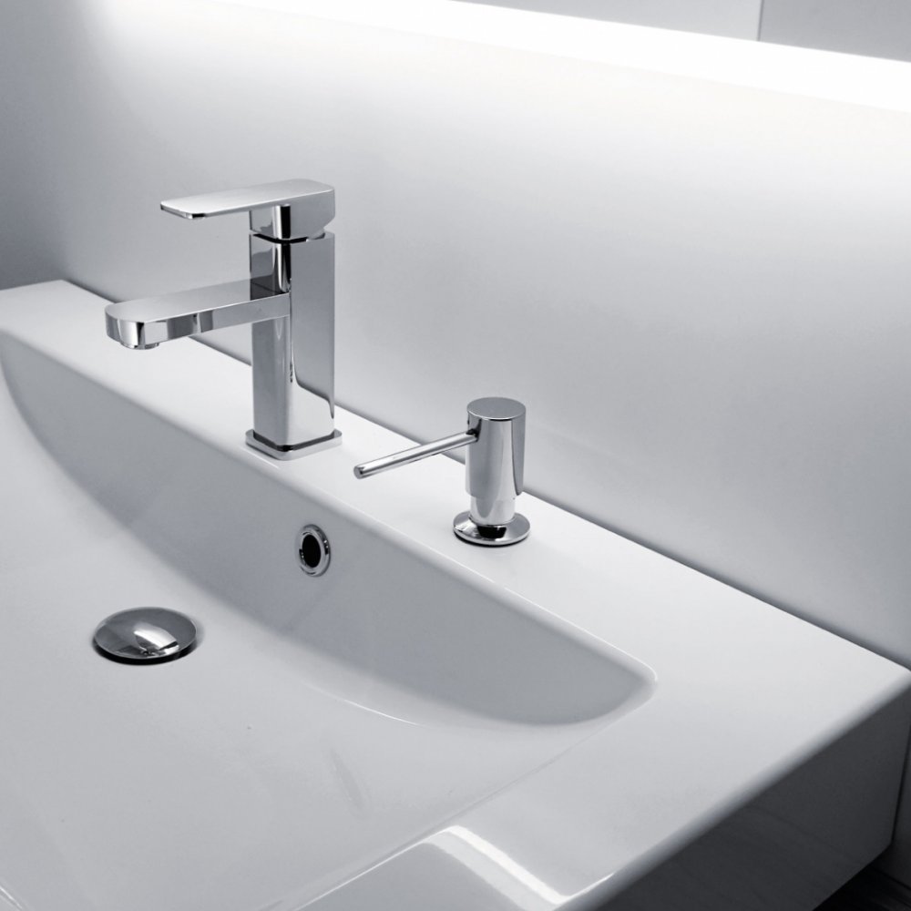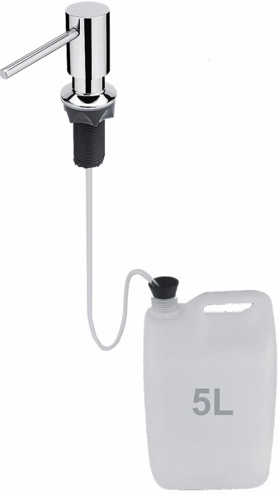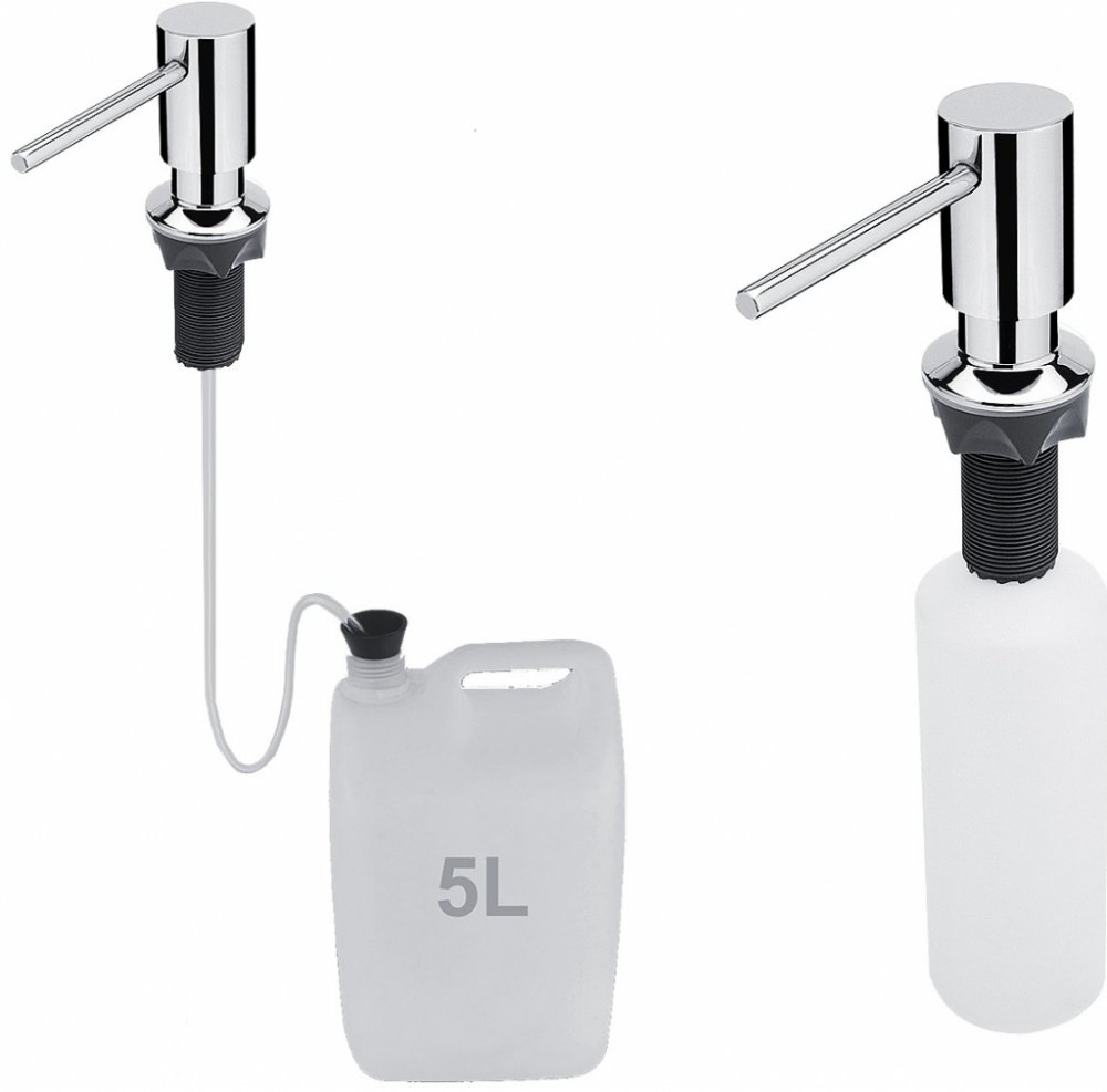 Vestavěný dávkovač na tekuté mýdlo, dezinfekční gel nebo prostředek k mytí nádobí. Hlava pumpy průměr 35 mm. Plnění 350 ml nádobky shora vyjmutím pumpy.