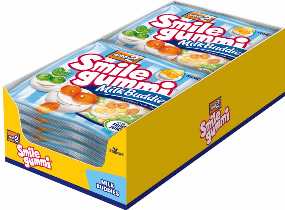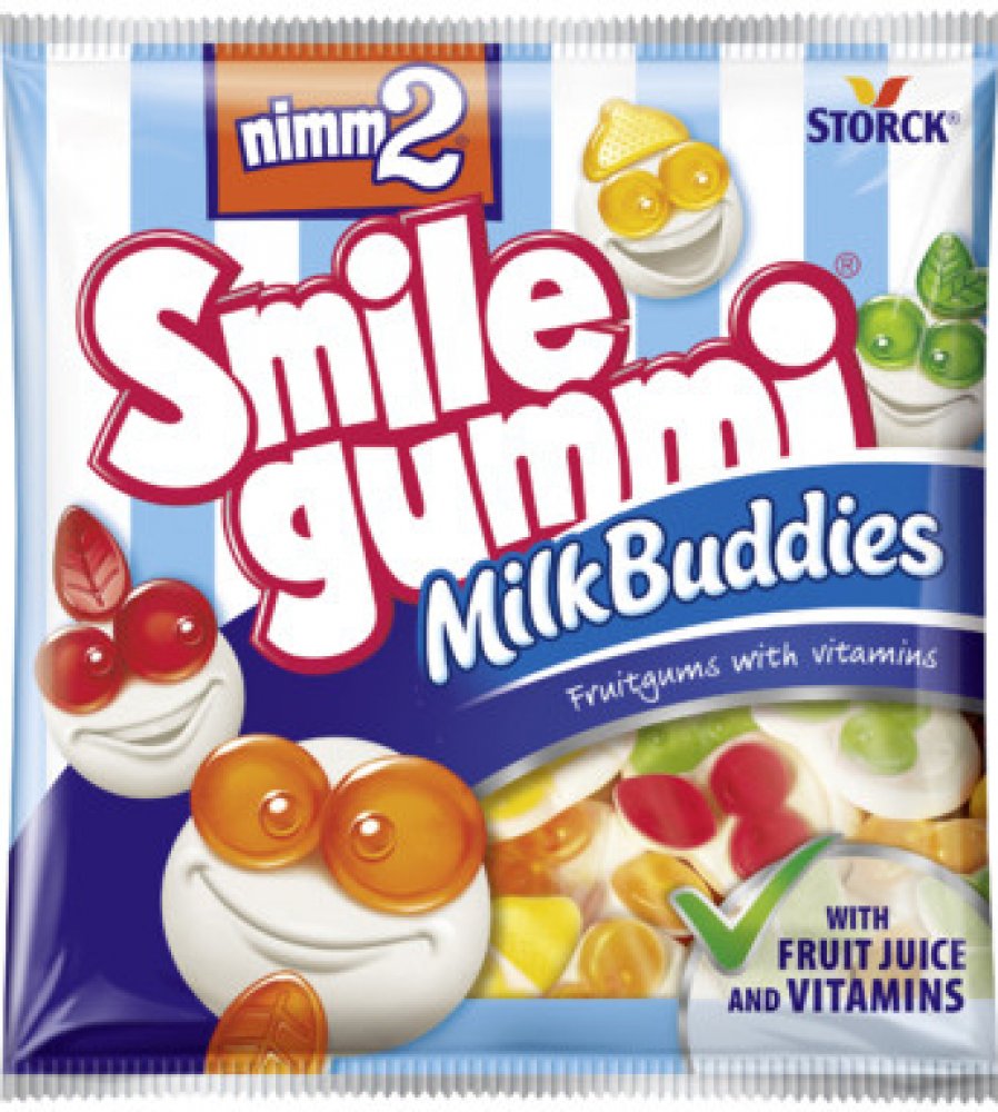 Glukózový sirup, cukr, zvlhčující látka: sorbitol; sušené odstředěné mléko (5,5%), ovocná šťáva (5%) z koncentrátu ovocné šťávy (hroznové víno, bezinky), jedlá želatina, kyseliny: kyselina citronová, kyselina mléčná; želírující látka: pektiny; aromata, hydrolyzovaná mléčná bílkovina, rostlinné koncentráty (černá mrkev, řasa Spirulina), niacin, vitamin E, kyselina pantothenová, vitamin B6, extrakt z kurkumy, biotin, vitamin B12, lešticí látky: karnaubský vosk, včelí vosk, bílý a žlutý.