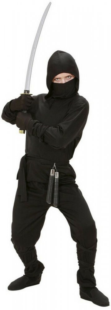 Ninja kostým obsahuje - černé tričko s kapucí, černé kalhoty, černý pásek, černou maska na obličej, černé stuhy na nohy a ruce. Pro děti od 5 do 13 let.