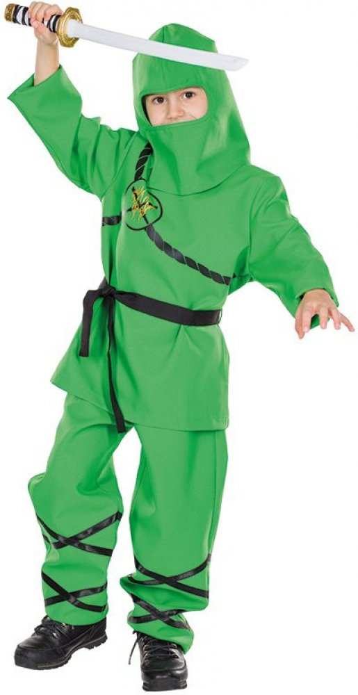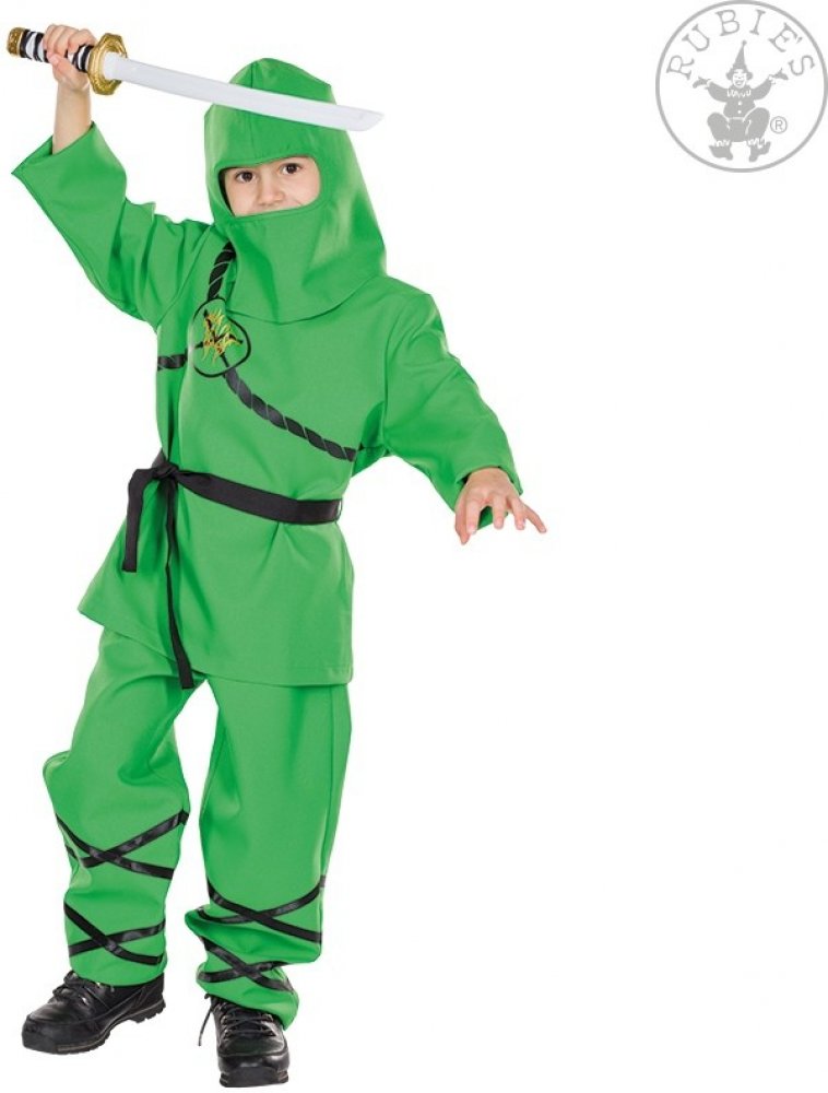 Zelený kostým ninja sestávající ze široké blůzy s potiskem, opasku z černé látky, kalhot s potištěným šněrováním nohou a kapuce.