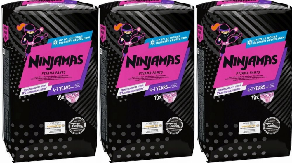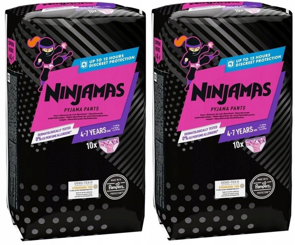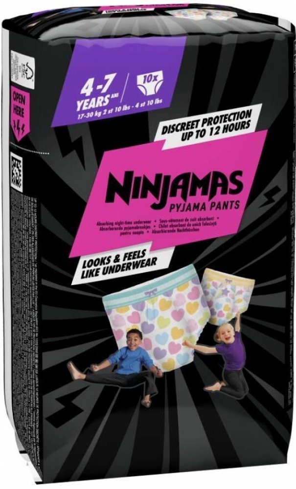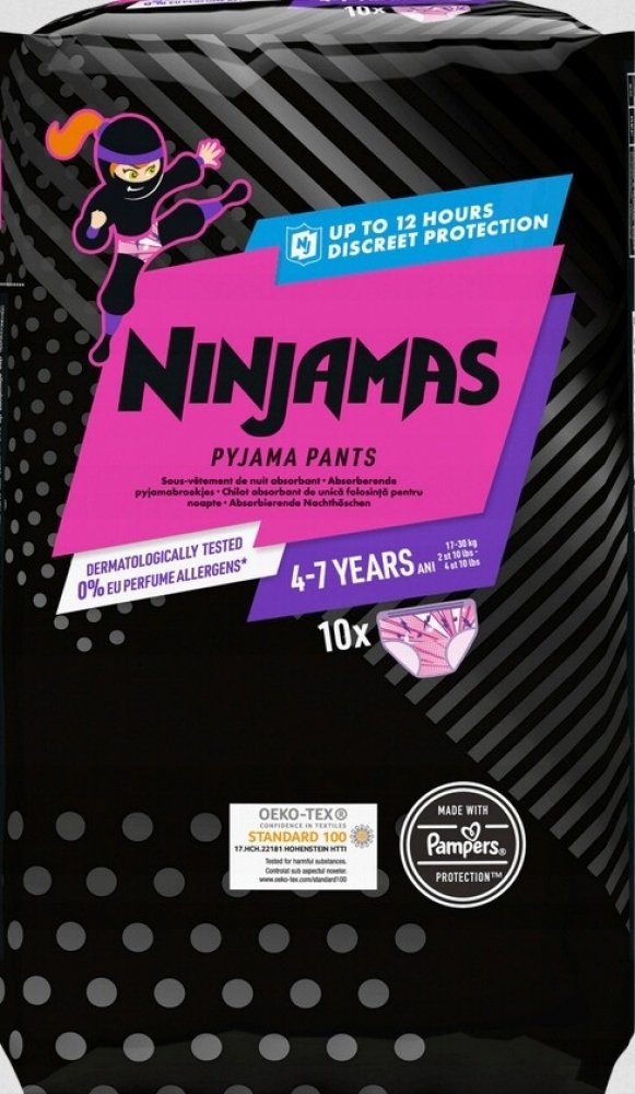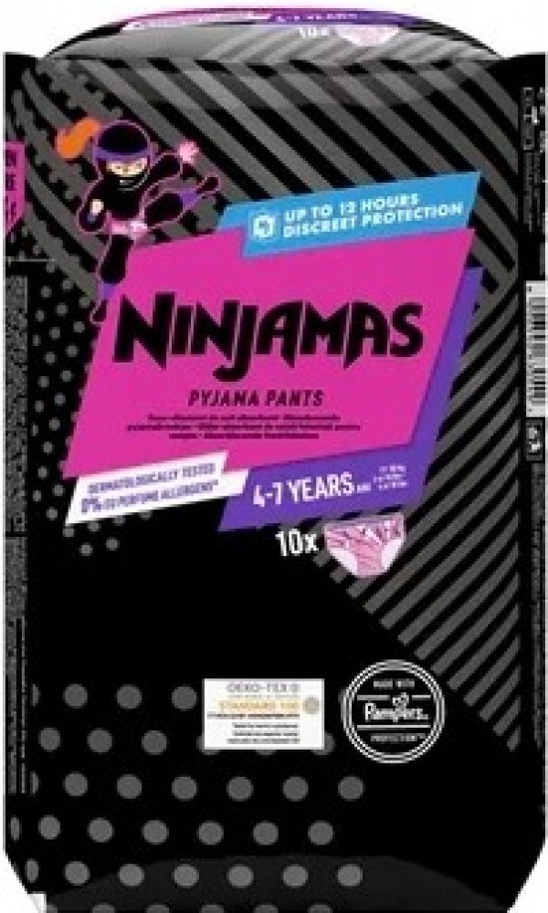 Ninjamas JP S7 jsou pyžamové noční kalhotky. Plenkové kalhotky absorbují díky technologii Instant Absorption okamžitě vlhkost pro dosud neviděnou účinnou ochranu. Díky pohodlnému pasu FormFit se přizpůsobují tělu dítěte, aby byly diskrétní a pohodlně padly jako spodní prádlo. Děti se tak mohou každý den probouzet se skvělým pocitem. Bezpečnost dítěte je prioritou.