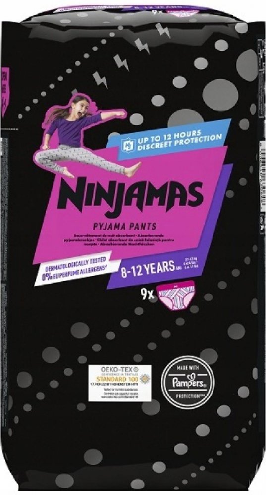 Představujeme vám… absorpční spodní kalhotky na noc Ninjamas Pyjama Pants! Postavte se nočním nehodám, aby se mohl/a díky ochraně před protečením po celou noc probouzet sebejistě. Absorpční spodní kalhotky na noc Ninjamas Pyjama Pants absorbují díky technologii Instant Absorption okamžitě vlhkost pro dosud neviděnou účinnou ochranu. Mají po celém obvodu pružný pas, který se přizpůsobuje bříšku děťátka tak, aby diskrétní a pohodlně padly jako spodní prádlo. Děti se tak mohou každý den probouzet se skvělým pocitem. Bezpečnost děťátka je pro vás prioritou. My se řídíme stejnou zásadou: absorpční spodní kalhotky na noc Ninjamas Pyjama Pants jsou dermatologicky testované a neobsahují žádné parfémy klasifikované jako alergeny (uvedené ve směrnici EU č. 1223/2009 o kosmetických přípravcích) a jsou certifikované podle normy OEKO-TEX Standard 100. Chcete se o složení dozvědět víc? Navštivte pampers.cz.