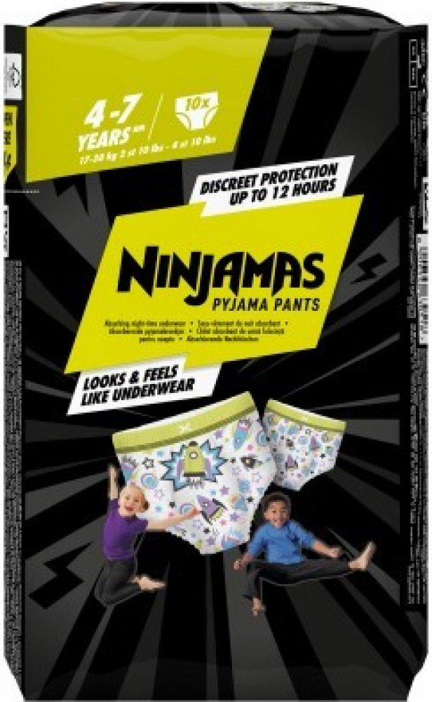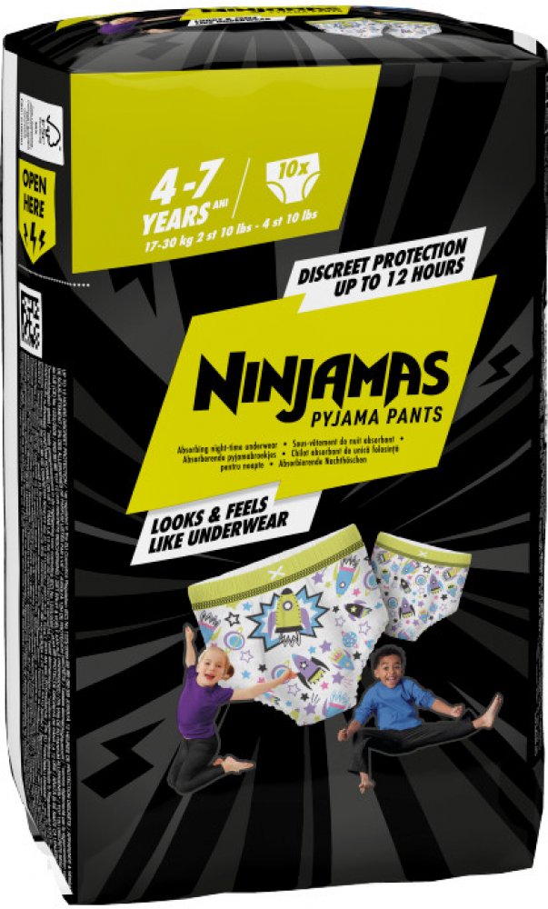 Plenkové kalhotky Ninjamas absorbují díky technologii Instant Absorption okamžitě vlhkost pro dosud neviděnou účinnou ochranu. Díky pohodlnému pasu FormFit se přizpůsobují tělu dítěte, aby byly diskrétní a pohodlně padly jako spodní prádlo. Děti se tak mohou každý den probouzet se skvělým pocitem.