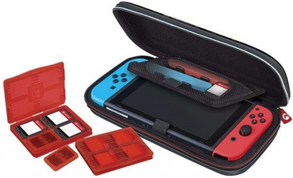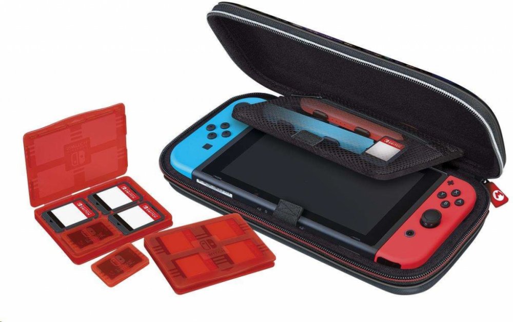 Je vybaveno zapuštěnou spodní vložkou, která konzoli bezpečně drží na místě a zajišťuje stabilitu během cestování. Pouzdro také obsahuje ochrannou "knihovnu", do které se vejde až 12 herních karet, a dvě pouzdra na microSD karty, z nichž každé pojme dvě microSD karty. Pro větší pohodlí je pouzdro vybaveno měkkým čisticím hadříkem, pohodlným držadlem a nastavitelným stojánkem, což z něj dělá perfektní doplněk pro hraní na cestách.