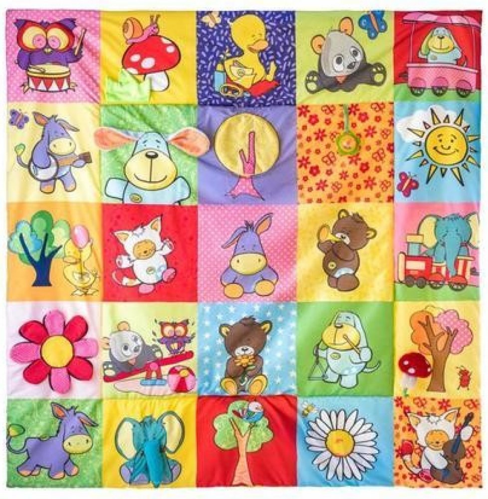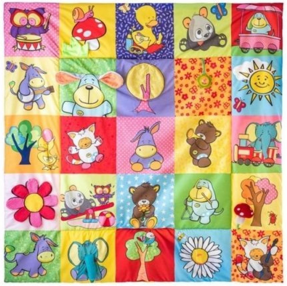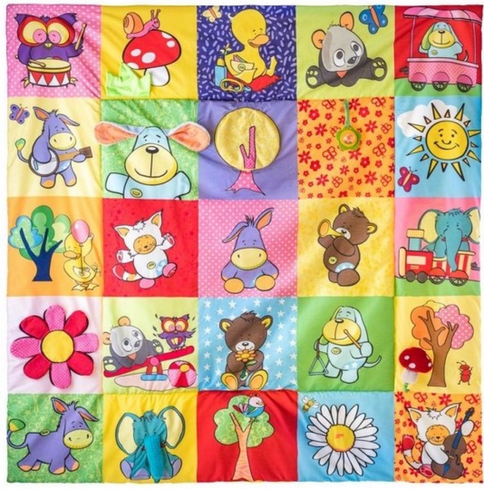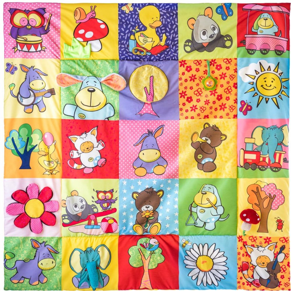 Prostorná hrací deka ve stylu patchwork nabízí mnoho hracích aktivit, které jsou zakomponovány do jednotlivých obrázků. Okvětní lístky, uši pejska, ocásek kočičky i zelený trs travičky vydávají po promnutí zvuk šustícího papíru. Chobot slona a mochomůrka mají zabudované pískátko. Okvětní lístky zeleného chrastítka ve tvaru kytičky jsou zároveň i kousátkem. Když odklopíte korunu zlutého stromu odha...