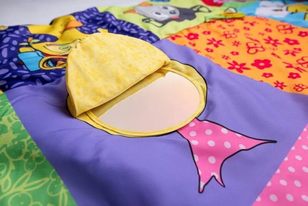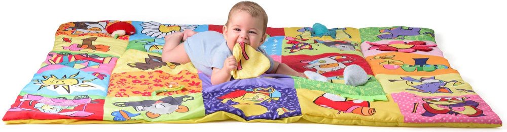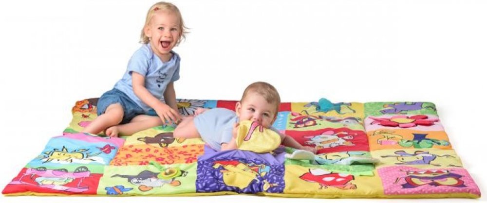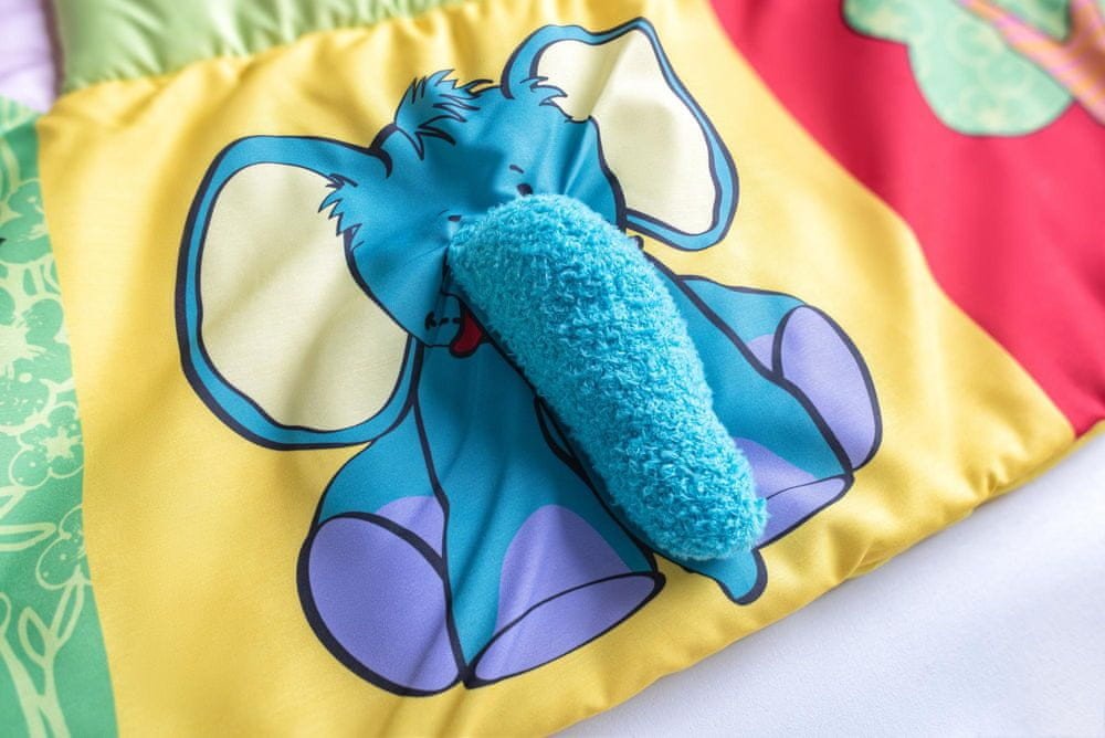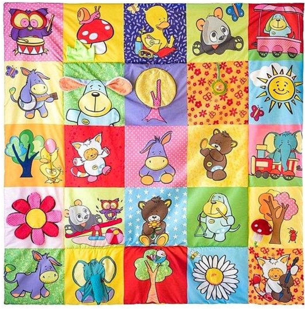 Prostorná hrací deka ve stylu patchwork nabízí mnoho hracích aktivit, které jsou zakomponovány do jednotlivých obrázků. Okvětní lístky, uši pejska, ocásek kočičky i zelený trs travičky vydávají po promnutí zvuk šustícího papíru. Chobot slona a mochomůrka mají zabudované pískátko. Okvětní lístky zeleného chrastítka ve tvaru kytičky jsou zároveň i kousátkem. Když odklopíte korunu zlutého stromu odha...