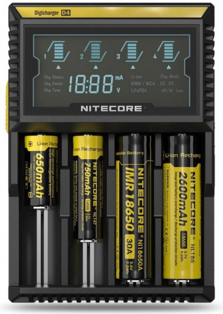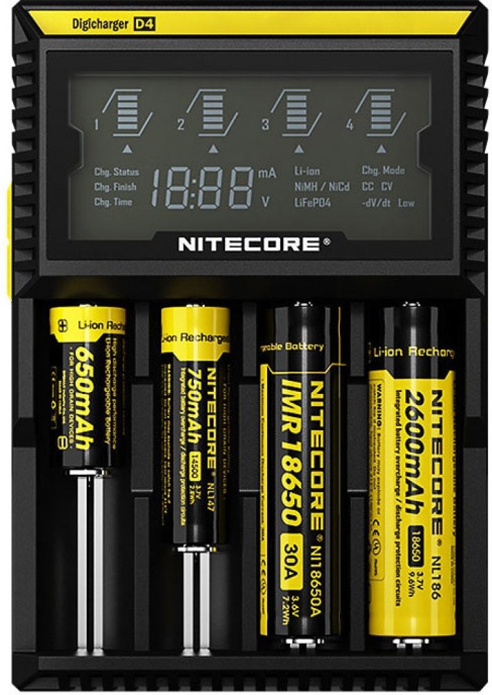 Nabíječka Nitecore D4 pro Ni-CD/ Ni-MH/ Li-Ion/ LiFePO4 Digitální nabíječka Nitecore D4Nitecore D4 je univerzální inteligentní nabíječka kompatibilní téměř se všemi dobíjecími bateriemi, což eliminuje potřebu vlastnit několik nabíječek. Nitecore D4 automaticky detekuje Li-ion, Ni-MH a Ni-Cd baterie, a přes ruční výběr je také schopný nabíjení LiFePO4 baterie. Inteligentní nabíjecí obvod vybere opt...