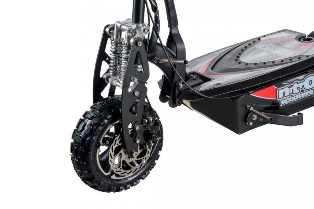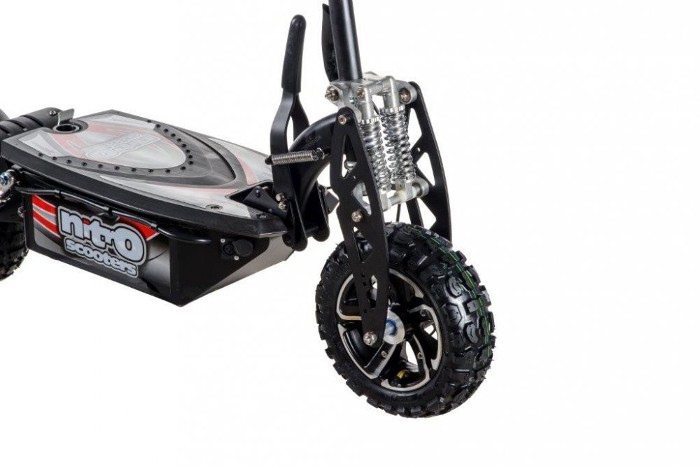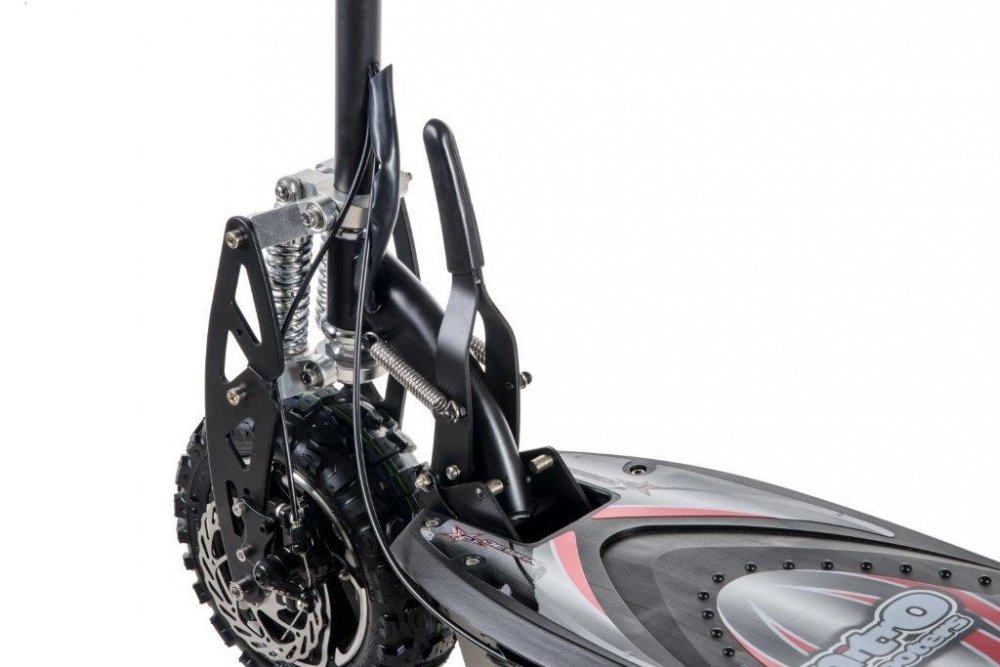 Tento model je vybaven jak předním tak zadním odpružením. Významnou inovací je přidání další pružiny do přední nápravy. Výsledkem je dokonalejší odpružení se zvýšenou bezpečností. Pružiny doplňují masivní bočnice v kombinaci s námi vyvinutým systémem vahadlového pružení pomocí ložisek. Starý systém (uložení napevno), který se stále u neznačkových koloběžek objevuje, byl velmi problematický.
