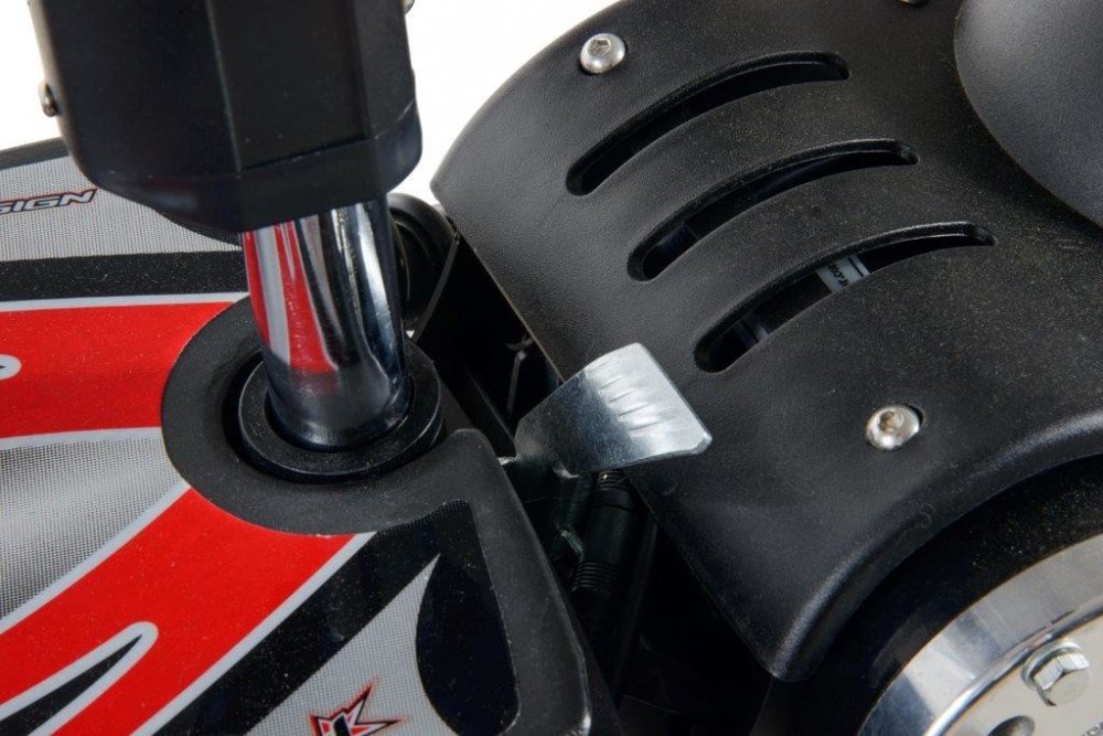 Pro uskladnění či převoz lze koloběžku jednoduše a rychle složit pouhým stlačením páky. Toto vyžaduje pouhých pár vteřin. Koloběžku lze díky možnosti složení naložit do kufru auta a jednoduše transportovat.