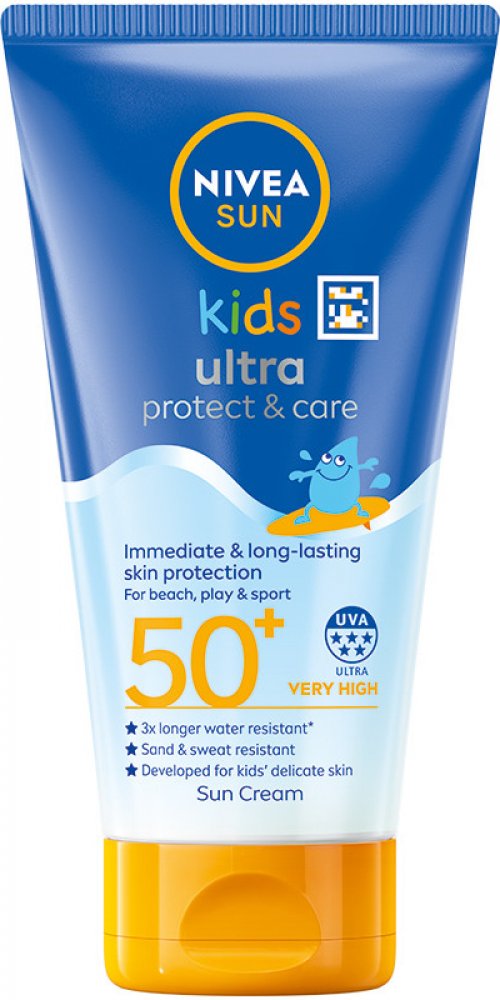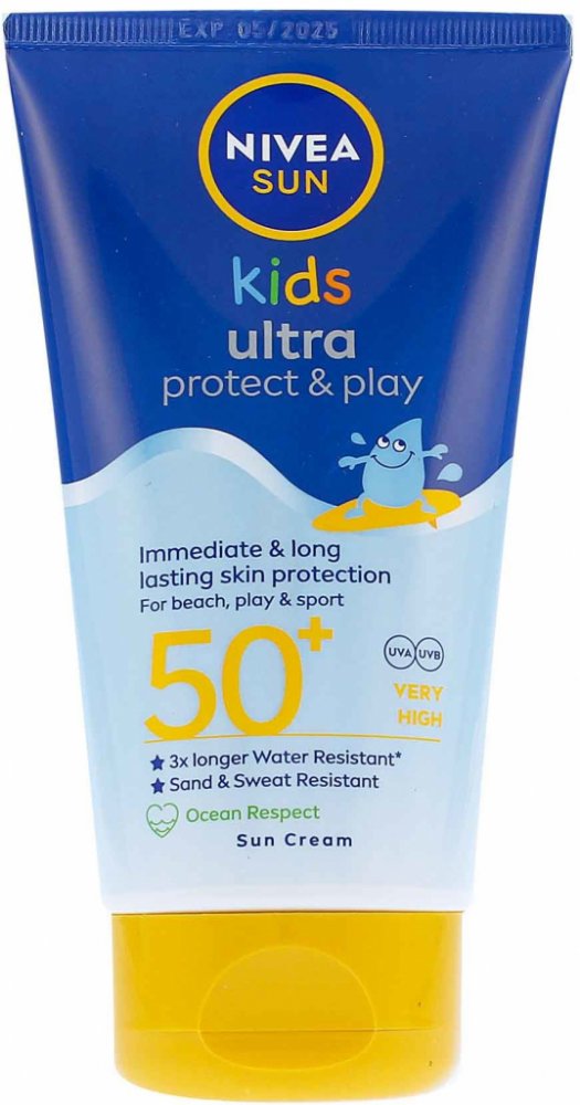 Na pláži, u bazénu, na dětském hřišti, ale třeba i při rodinném výletě na kolech. Tady všude se můžete spolehnout na okamžitou ochranu před UVA a UVB zářením. Dětské mléko na opalování je až 3krát déle voděodolné oproti standardním voděodolným přípravkům. Ustojí dětské hrátky na písku, ve vodě a je vysoce odolné i vůči dětskému potu. A ochranný faktor 50+? Nutnost, pokud chcete svého potomka opravdu účinně chránit před škodlivými účinky slunečních paprsků. Navíc obsahuje zklidňující panthenol a vitamíny C a E a hydratuje a pečuje o dětskou pokožku.Dětské mléko od značky NIVEA neobsahuje UV filtry octinoxate, oxybenzone, octocrylene ani mikroplasty. Ideální parťák na léto k vodě: NlVEA SUN dětské mléko na opalování Ultra Protect & Care SPF 50+.*Zdroj: Euromonitor International Limited; postavení značky NIVEA v kategorii sluneční kosmetika pro děti; maloobchodní prodeje v hodnotě za rok 2023.VAROVÁNÍ:Aplikujte v dostatečném množství před sluněním a k udržení ochrany pravidelně opakujte, zejména v případě pocení, po koupání a po osušení ručníkem. Menší množství významně snižuje stupeň ochrany. Nezůstávejte na slunci příliš dlouho, i když jste použili prostředky na ochranu proti slunečnímu záření; nadměrná sluneční expozice představuje vážné zdravotní riziko. Ani výrobky proti slunečnímu záření neposkytují 100% ochranu. Kojence a malé děti nevystavujte přímému slunečnímu záření. Chraňte dítě před slunečním zářením oblečením a používejte dostatečné množství sluneční ochrany na nezakrytá místa. Nechte důkladně vstřebat a vyhněte se přímému kontaktu s oblečením a tvrdými povrchy, může zanechat stopy.Složení:Aqua, Glycerin, Isopropyl palmitate, Alcohol denat., Butyl methoxydibenzoylmethane, Cocoglycerides, Bis-ethylhexyloxyphenol methoxyphenyl triazine, Ethylhexyl salicylate, Titanium dioxide (nano), Butylene glycol dicaprylate/dicaprate, C12-15 alkyl benzoate, Hydrogenated rapeseed oil, Diethylamino hydroxybenzoyl hexyl benzoate, Ethylhexyl triazone, Silica dimethyl silylate, Phenylbenzimidazole sulfonic acid, Prunus amygdalus dulcis oil, Tocopheryl acetate, Behenyl alcohol, Stearyl alcohol, Hydroxypropyl starch phosphate, Cellulose gum, Phenoxyethanol, Xanthan gum, Hydroxyacetophenone, Silica, Sodium stearoyl glutamate, Trisodium EDTA, Dimethicone, Sodium hydroxide, Sodium chloride, Parfum