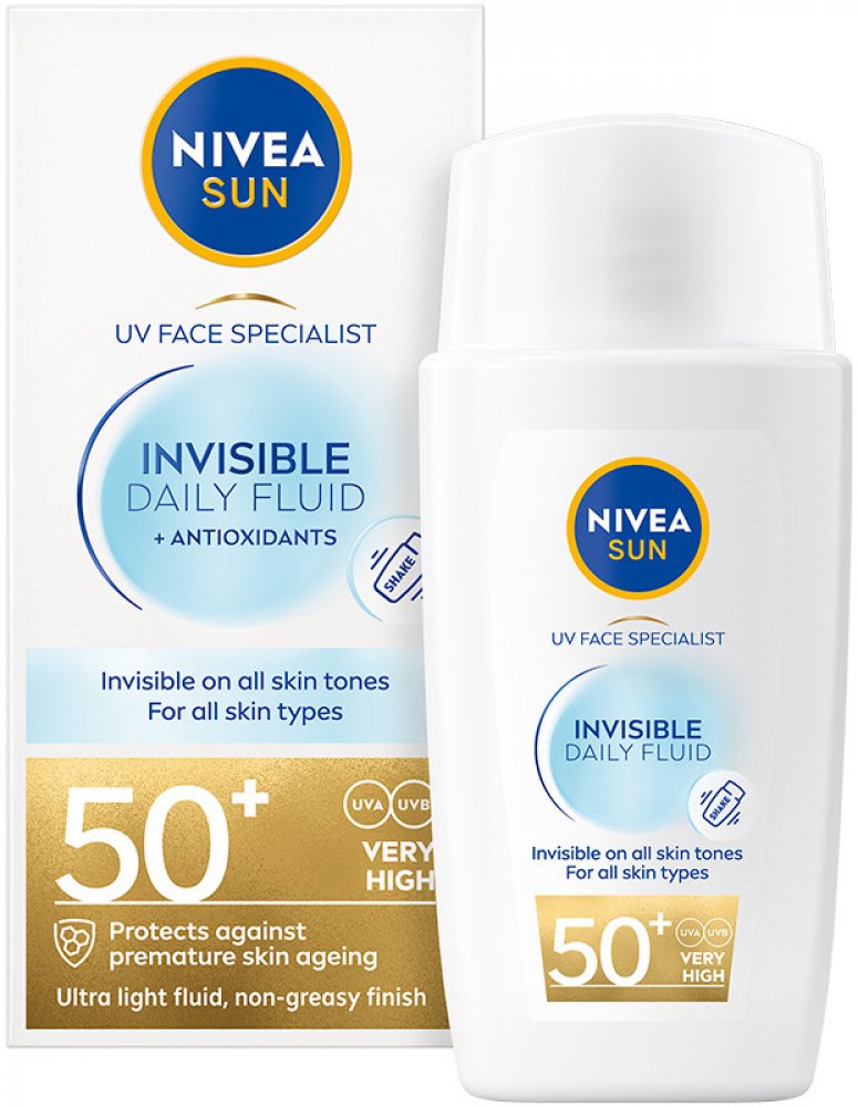 Ultra lehký pleťový fluid Nivea SUN Invisible Fluid SPF 50+ chrání pokožku před slunečním zářením, rychle se vstřebává, neucpává póry a postará se sjednocený a zdravý vzhled pleti.
