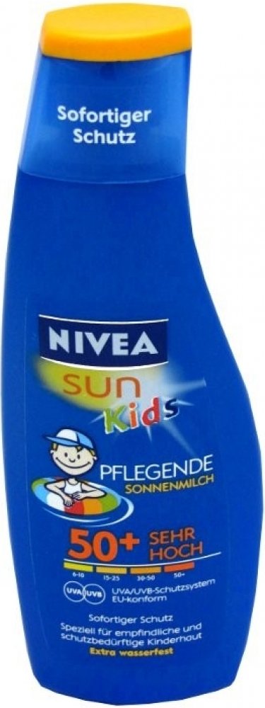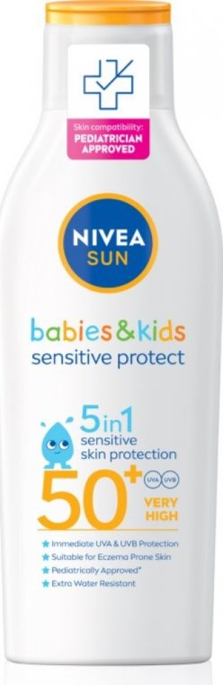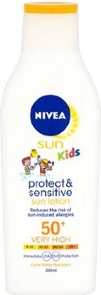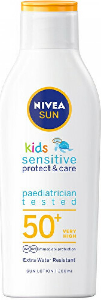 NIVEA SUN Kids, 200 ml, Sluneční kosmetika pro děti pro děti, Dětská kůže je vůči slunečním paprskům mimořádně citlivá a proto je důležité poskytnout jí dostatečně účinnou a spolehlivou ochranu. Opalovací přípravek NIVEA SUN Kids se o to postará. Díky kombinaci účinných UV filtrů zabrání podráždění, spálení či jinému poškození způsobenému škodlivým slunečním zářením. Jeho složení vytvořené speciálně pro potřeby dětí zároveň zajistí tu nejjemnější péči, která bude vyhovovat i té necitlivější kůži. Vlastnosti: chrání kůži před UVA i UVB zářením vyživuje pokožku a pečuje o ni má voděodolnou texturu hodí se pro citlivou pleť je šetrný k jemné dětské kůži Jak používat: Naneste na čistou pokožku a jemně vmasírujte do úplného vstřebání. Aplikujte ochranné prostředky v dostatečném množství a opakovaně.