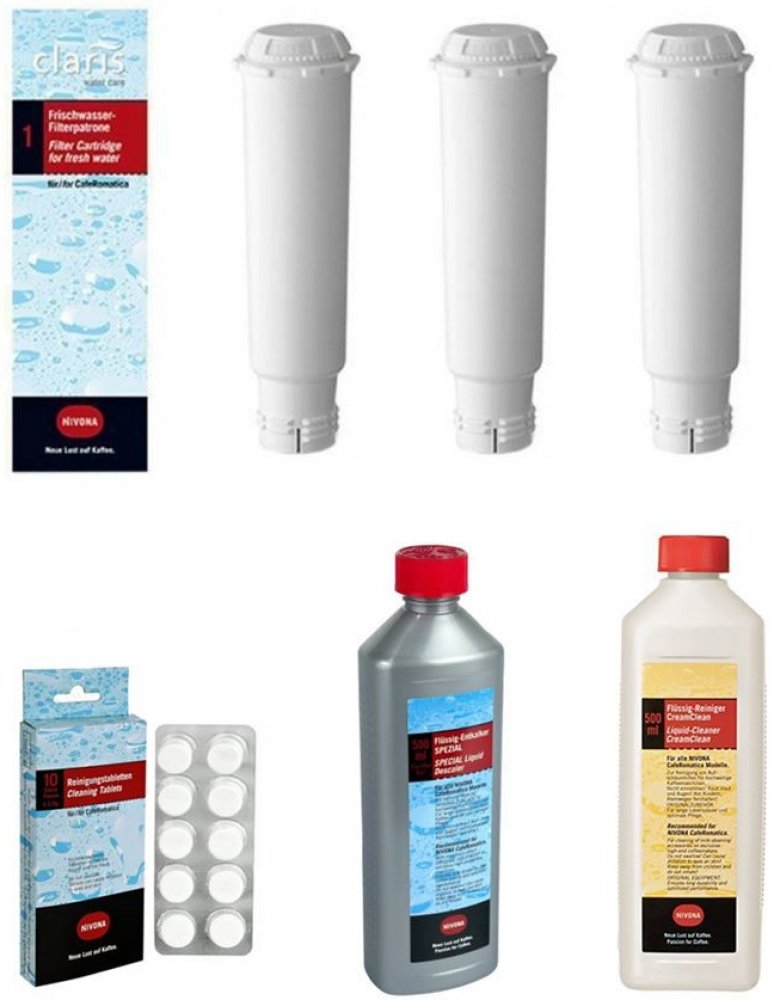 Nivona NIRF700 Claris je originální vodní filtr pro kávovary a espressa Nivona, modelovou řadu Cafe Romatica. Filtr je vyroben výhradně z organického materiálu bez přídavku chemických látek a vkládá se přímo do zásobníku na čistou vodu. Pravidelná výměna filtru v kávovarech Nivona zabrání následnému odstraňování vodního kamene a prodlužujete jeho životnost.Nivona NIRK703 500 ml je tekutý odstraňovač vodního kamene pro kávovary značky Nivona. Můžete být použít i pro všechny automatické kávovary jiných značek. Produkt je šetrný k materiálům, ze kterých je kávovar vyroben.Automatické kávovary značky Nivona jsou vybaveny integrovaným programem na odstraňování vodního kamene. Pravidelným odstraňováním vodního kamene šetříte vaše zařízení a prodlužujete jeho životnost. Láhev o objemu 0,5 litru vystačí na 5 čisticích procesů.Nivona NICC 705 tekutý odstraňovač zbytků mléka 500 mlPokud připravujete nápoje s mlékem, je vhodné začít pravidelně používat čisticí prostředek, který udržuje vaše zařízení v dobré kondici a nemá negativní vliv na chuť kávy. Prostředek spolehlivě odstraní zbytky mléka z okruhu, kterým mléko protéká. Díky Nivona NICC 705 si můžete pochutnat na hygienicky nezávadné mléčné pěně. Při pravidelném používání tohoto čisticího přípravku plně postačí dávkování s vodou v poměru 1:10.Nivona NIRT 701 čistící tablety 10 ks jsou určené pro automatické kávovary značky Nivona. Tablety NIRT 701 jsou speciálně vyvinuté k rozpouštění nečistot a optimálně odstraňují např. tuk z kávových zrn. Pravidelné čištění šetří váš kávovar a garantuje intenzivní aroma připravované kávy. Poznámka:• Přesný popis použití tohoto výrobku naleznete v návodu svého přístroje.Součástí balení jsou 3 ks filtru Nivona NIRF700 Claris + 1 ks Nivona NIRK703 odstraňovač vodního kamene 500 ml + 1 ks Nivona NIRT 701 čistící tablety 10 ks + 1 ks Nivona NICC 705 tekutý odstraňovač zbytků mléka 500 ml.