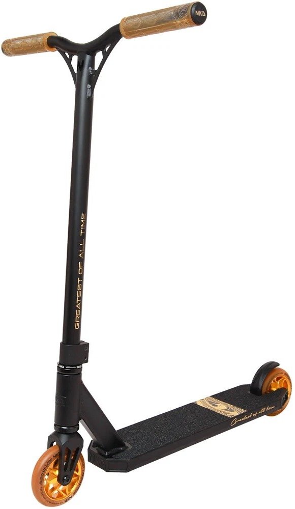 NKD GOAT Stunt Scooter Black Gold - Lehká, robustní a stylová koloběžkaNKD GOAT Stunt Scooter Black Gold je ideální základní kaskadérská koloběžka pro mladé jezdce, kteří si chtějí vyzkoušet své první triky. Díky lehké hliníkové palubě a zesíleným chromolymerovým řídítkům nabízí tato koloběžka dokonalou rovnováhu mezi ovladatelností a robustností - je ideální pro skateparky, jízdu na ulici a kaskadérské kousky.Ideální pro děti a dospívající (cca 8-16 let) - začátečníky a mírně pokročiléHliníková paluba: dostatečně robustní pro skoky a dostatečně lehká pro optimální ovládáníChromolymerová řídítka: robustní a navržená pro každodenní použití110mm kolečka s ložisky ABEC 9: pro hladkou, rychlou a svižnou jízduMěkké gripy zajišťují pohodlí při každé jízdě