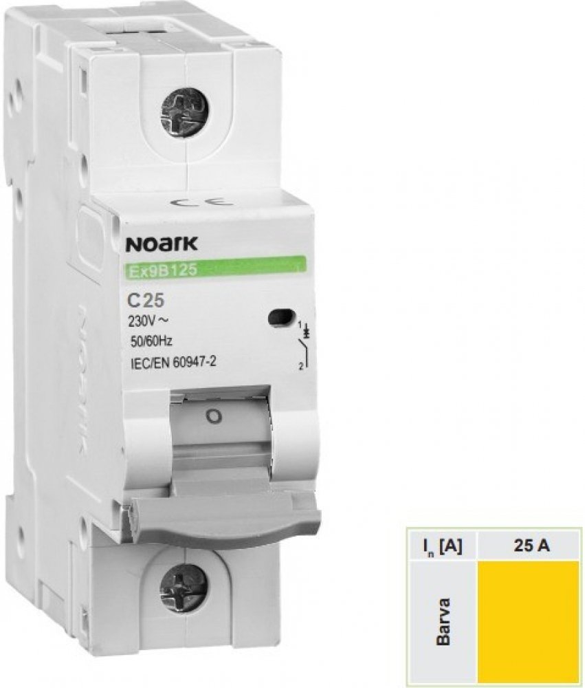 Instalační jističe řady Ex9B125 jsou vhodné zejména pro aplikace v oblasti distribuce energie či v průmyslu. Slouží jako ochrana při zkratu a proudových přetíženích se jmenovitým proudem až do 100 A a velmi vysokými hodnotami zkratových vypínacích schopností (testováno dle ČSN EN 60947-2). Tyto jističe lze kombinovat s širokou nabídkou příslušenství (shodným s přístroji řad Ex9B and Ex9PN) včetně pomocných a signalizačních kontaktů, vypínacích spouští, podpěťových a nadpěťových spouští. Lze vytvářet rozlišné kombinace příslušenství. Základní údaje Jmenovitá vypínací schopnost Icn IEC 60947-2 230V 25 Frekvence Jmenovitý proud 25 Jmenovitá vypínací schopnost Icn EN 60898 230V 20 Současné spínání N-neutral NE Přepěťová kategorie 3 Vhodné pro zapuštěnou instalaci 75 Počet krytých pólů 1 Počet pólů (celkem) 1 Jmenovité napětí 230 Stupeň znečištění 3 Věstavěná hloubka ANO Charakteristika C Instalační třída 3 Šířka v modulech 1.5 Typ napětí AC Vhodné pro zapuštěnou instalaci ANO Stupeň krytí (IP) IP20
