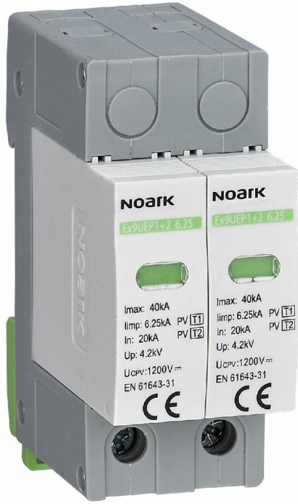Noark 111751 Ex9UEP1+2 6,25 2P 1000 EU DC svodič přepětí Ex9UEP, třída 1+2, In=6,25kA Svodiče přepětí DC Ex9UEP jsou vhodné pro fotovoltaické aplikace. Tyto svodiče přepětí jsou navrženy a testovány v souladu se zkušební třídou PV T1+T2 podle normy EN 61643-31. Konstrukce s vyměnitelnými moduly umožňuje pohodlnou výměnu opotřebovaného modulu bez nutnosti odpojovat celé zařízení. Svodiče přepětí DC vhodné pro fotovoltaické aplikace Fotovoltaické svodiče typu T1+T2 (třída I+II, typ 1+2, B+C) Jmenovitý výbojový proud V 20 kA (8/20 µs) Maximální vybíjecí proud Imax 40 kA (8/20 µs) Impulzní vybíjecí proud Iimp 6,25 kA (10/350 µs) Maximální trvalé provozní napětí UCPV od 500 do 1500 V DC Varianty pro uzemněné a neuzemněné fotovoltaické systémy