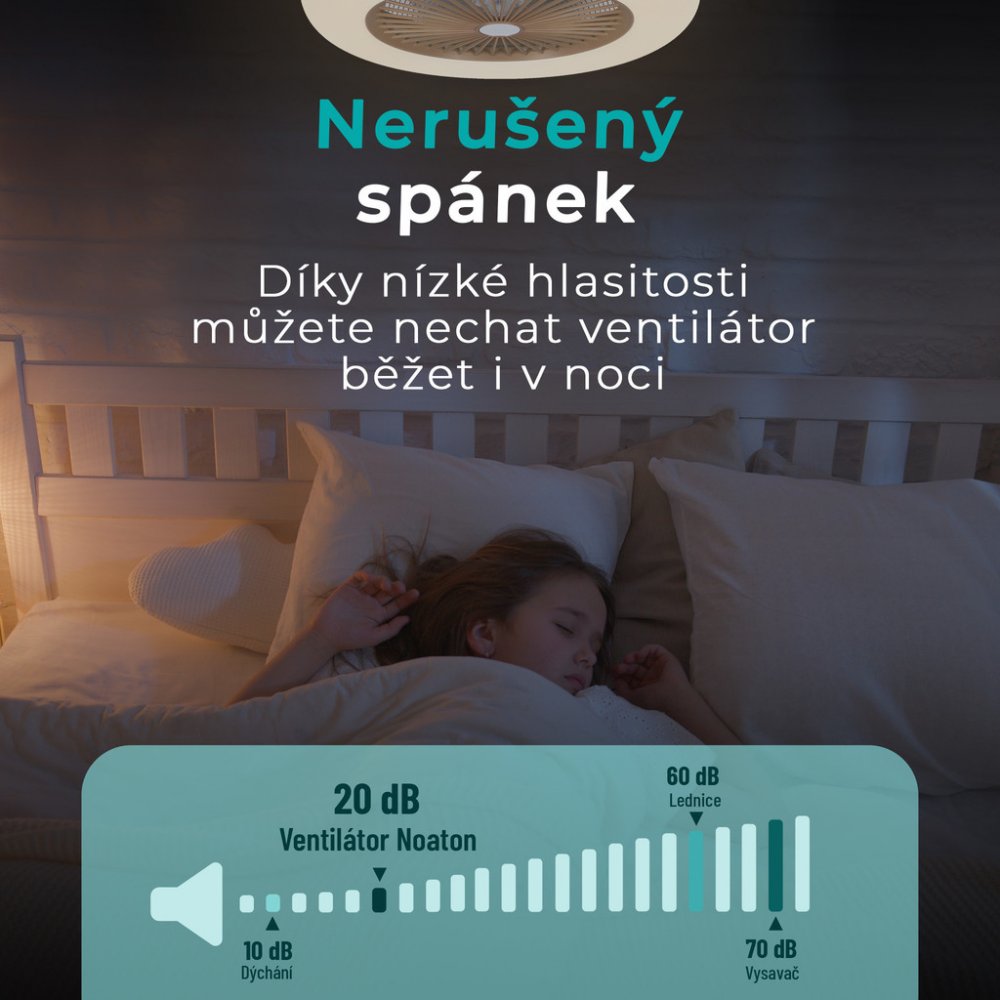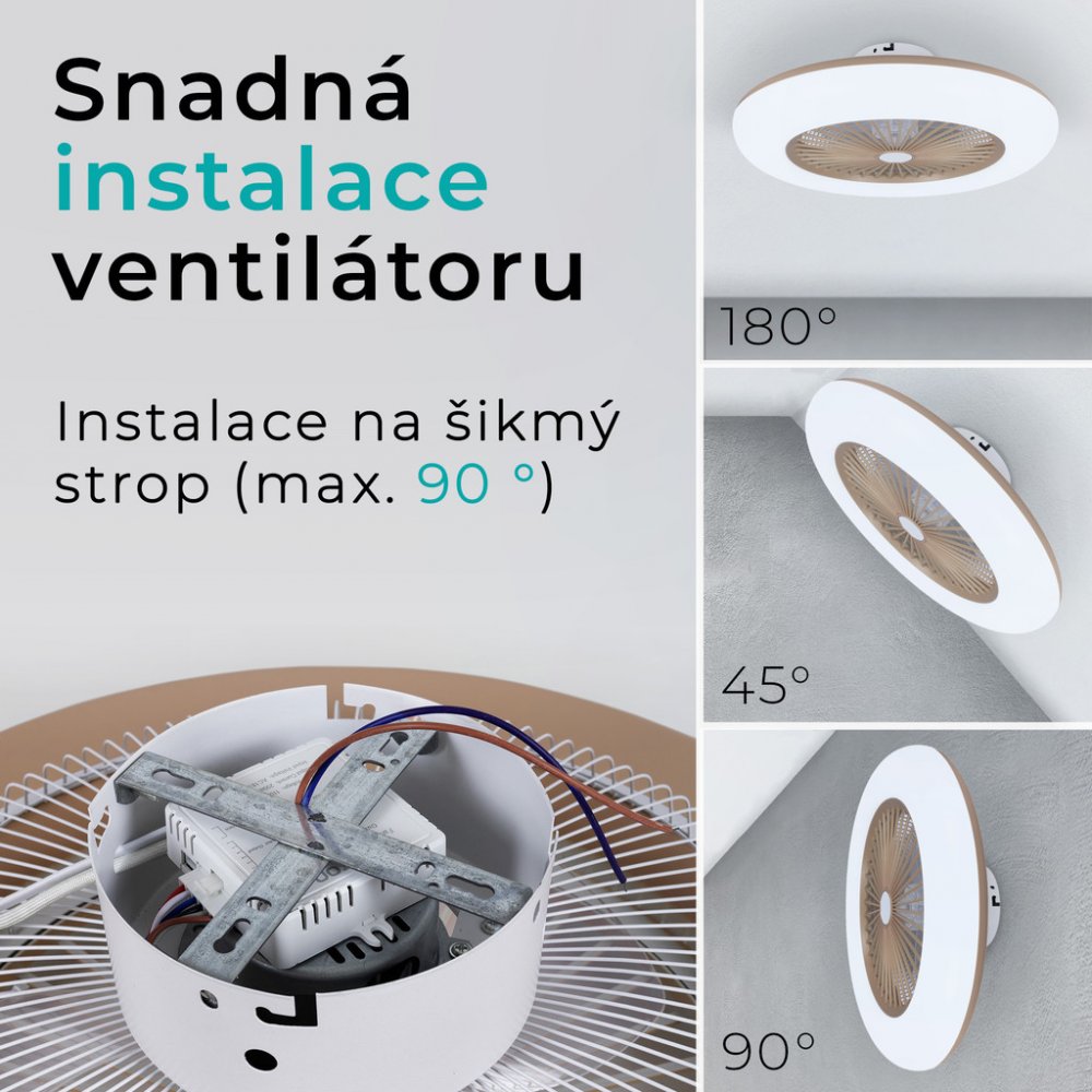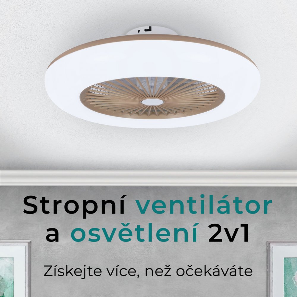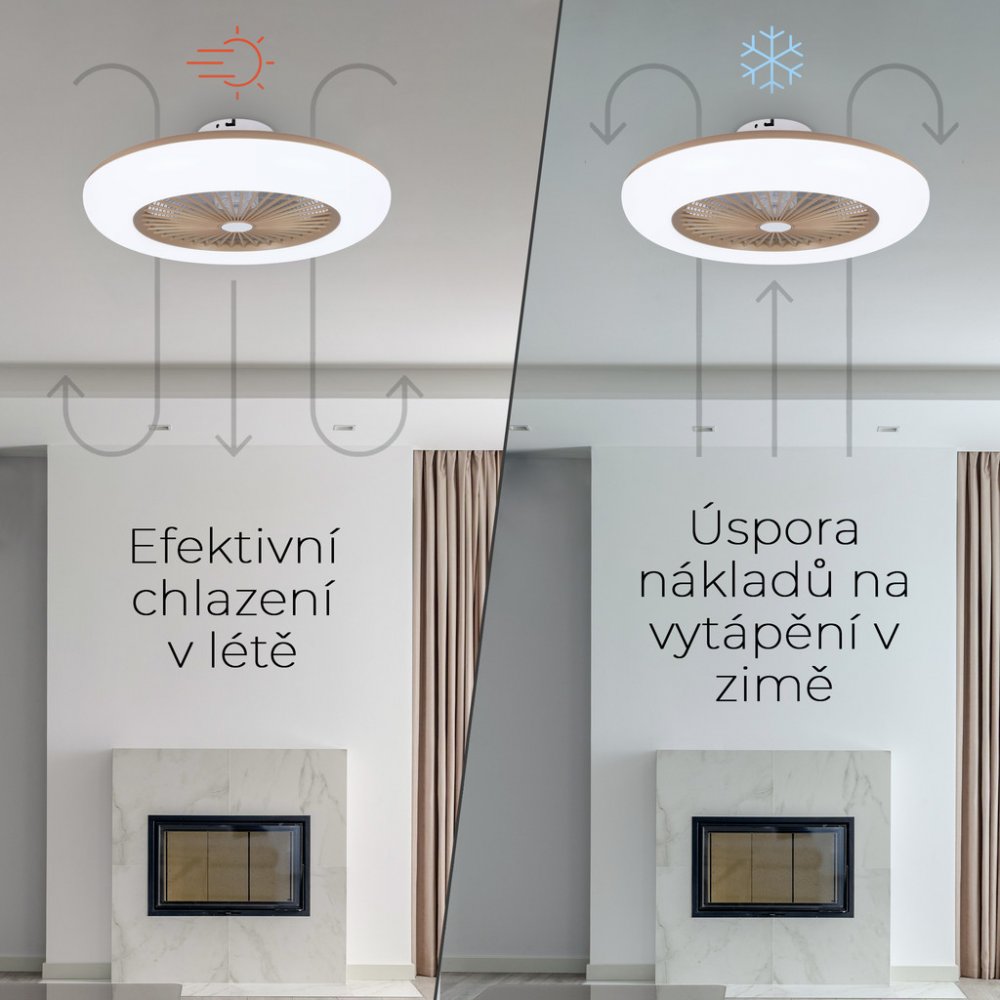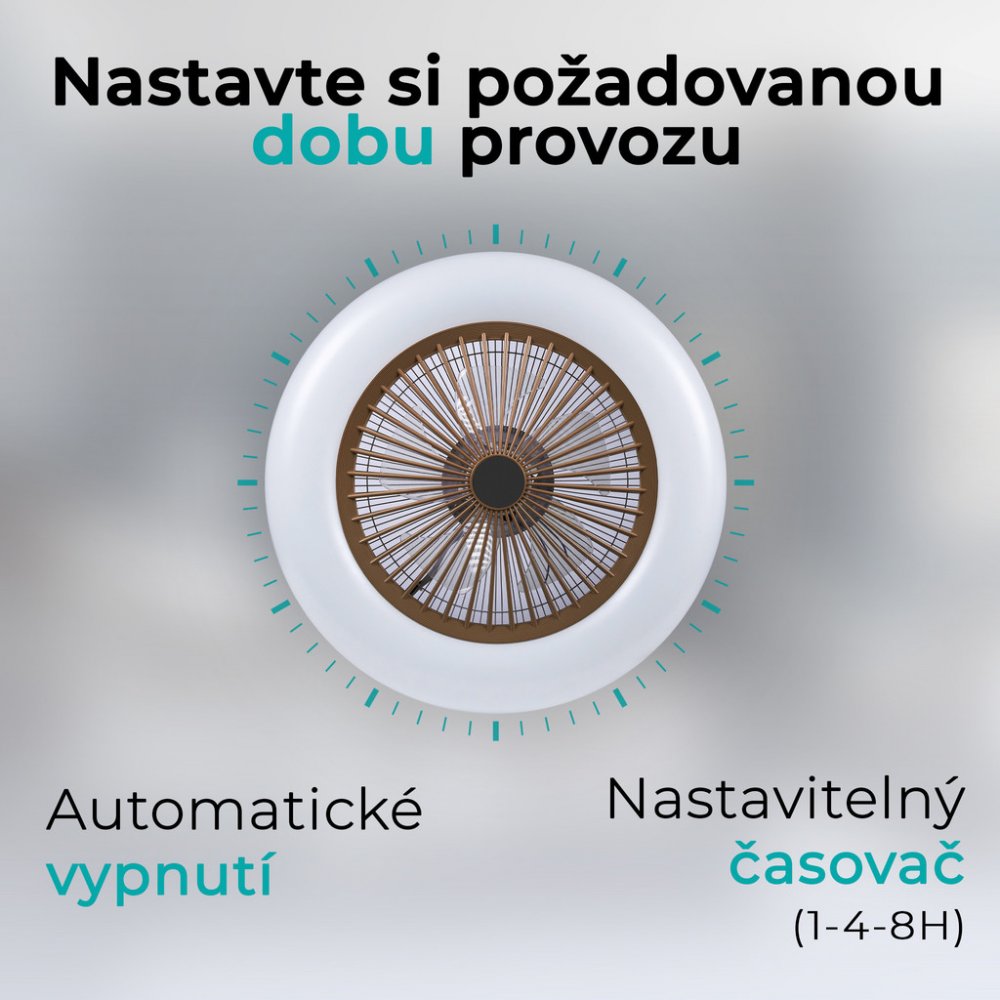 Výkonný stropní větrák se světlem je vybaven 5 lopatkami (materiál ABS), jež lze pohánět hned ve 3 rychlostních stupních. Dále ventilátor obsahuje regulovatelné světlo a časovač. To vše z něj dělá všestranného pomocníka jak do domácnosti, kanceláře, či jakéhokoliv jiného pokoje.