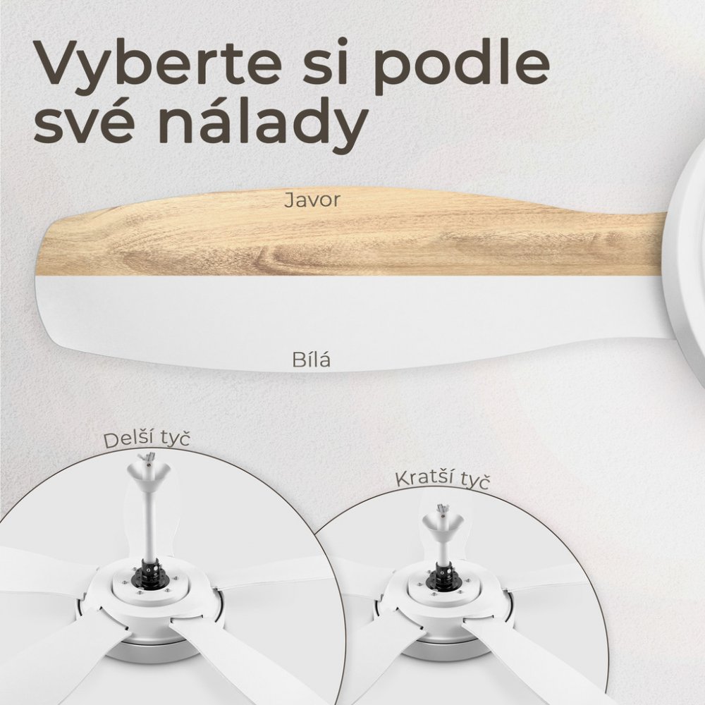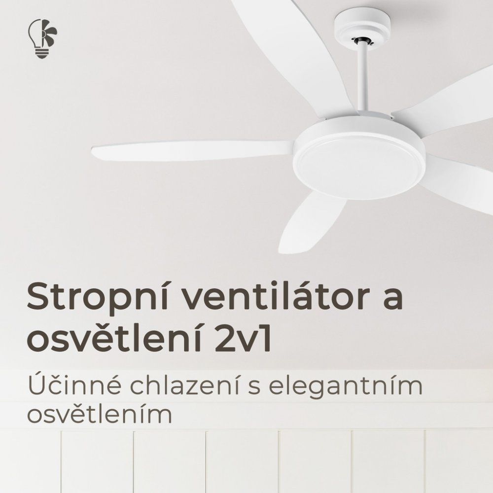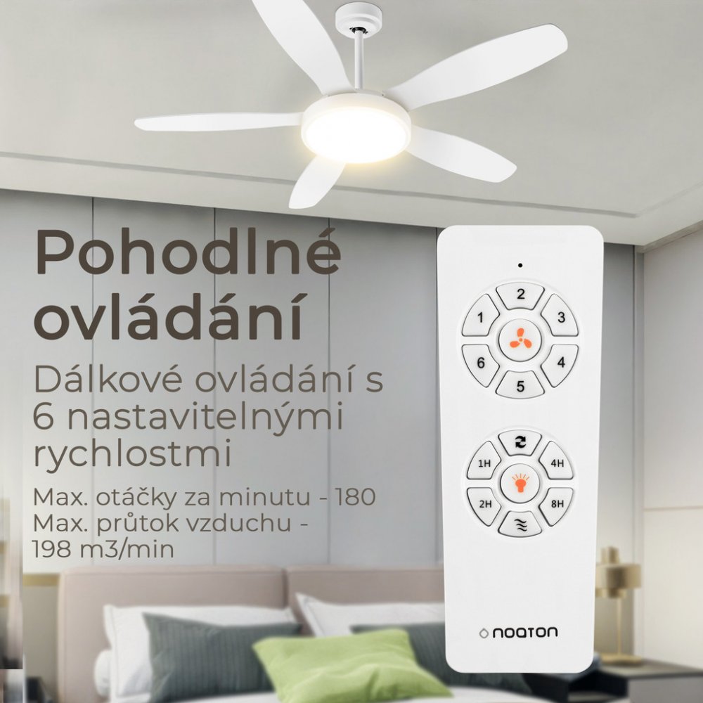STROPNÍ VENTILÁTOR SE SVĚTLEM MAIA Tento stropní ventilátor s oboustrannými lopatkami (bílá/maia) má integrované LED světlo. Zajišťuje nejen účinné větrání, ale také osvětlení místnosti. Díky průměru 132 cm a pěti lopatkám má tento ventilátor průtok vzduchu 99 až 198 m3/min, což zajišťuje dostatečnou cirkulaci vzduchu v místnosti. Modul LED má maximální výkon 24 W a lze jej přizpůsobit teplotě světla od 3000 do 5700 K.Ventilátor se ovládá dálkovým ovládáním. Ventilátor lze namontovat na šikmý strop s maximálním sklonem 30°. Nabízí také zimní funkci (reverzní provoz) pro použití v chladnějších měsících. Spotřeba motoru se pohybuje mezi 5 W a 41 W. Všechny tyto vlastnosti zajišťují nejen funkčnost, ale také stylové vybavení každé místnosti.FUNKČNÍ PRINCIP STROPNÍHO VENTILÁTORU Stropní ventilátory jsou zařízení, která prostřednictvím průvanu ovlivňují naše vnímání tepla a chladu. Jinými slovy, v létě není třeba tolik ochlazovat vzduch, i když je v našem domě teplota 27 °C. Ve skutečnosti nám stropní ventilátor dává stejný pocit, jako když je teplota 22 °C. Kromě toho je samotný spotřebič velmi úsporný (spotřebuje méně energie než 100wattová žárovka) a lze s ním ušetřit spoustu elektrické energie. Mnoho lidí proto dává přednost stropnímu ventilátoru před klimatizací kvůli příjemnému a přirozenému vánku, který vytváří.KAM UMÍSTIT STROPNÍ VENTILÁTOR SE SVĚTLEM Při umístění stropního ventilátoru se světlem je třeba vzít v úvahu 2 věci - proudění vzduchu a světlo. Vzhledem k tomu, že ventilátor vyfukuje kužel vzduchu přímo pod sebe a poté se snáší po podlaze, je dobré jej umístit do středu místnosti nebo tam, kde může vzduch co nejefektivněji redistribuovat. Vždy mějte na paměti, že se jedná také o praktické osvětlení, proto vybírejte nejvhodnější místo pro ventilátor s ohledem na tuto funkci.Dbejte také na to, aby se v blízkosti ventilátoru nenacházely žádné překážky, které by mohly bránit proudění vzduchu nebo zasáhnout spotřebič (např. dveře skříně v horní části apod.).SNADNÁ INSTALACE A JEŠTĚ SNADNĚJŠÍ ÚDRŽBA Instalaci tohoto ventilátoru s osvětlením zvládne každý. Přístroj je dodáván se zástrčkami a šrouby. To znamená, že potřebujete pouze šroubovák a šikovnou ruku.Ventilátor se pak pomocí šroubů a hmoždinek připevní ke stropu (nebo ke stěně) a připojí se přímo k elektrické síti. Tím získá přístroj potřebnou energii pro svůj provoz. Další informace o instalaci najdete samozřejmě v návodu.A následná údržba? Ta je více než jednoduchá. Doporučujeme spotřebič alespoň dvakrát ročně zkontrolovat, v případě potřeby dotáhnout šrouby (mohou se uvolnit vlivem pravidelných vibrací) a čas od času jej vyčistit. Pokud jde o čištění, stačí ventilátor odpojit od zdroje napájení a očistit jeho povrch měkkým vlhkým hadříkem.DÁLKOVÉ OVLÁDÁNÍ Stropní ventilátor Maia od společnosti Noaton je vybaven dálkovým ovládáním. To není třeba speciálně párovat a můžete jej používat ihned po instalaci ventilátoru.Ovládání funguje na principu infračerveného záření (IR), což umožňuje ovládat jedním dálkovým ovladačem několik ventilátorů stejného modelu současně, pokud jsou v dosahu, ideálně ve vzdálenosti 4 metrů.