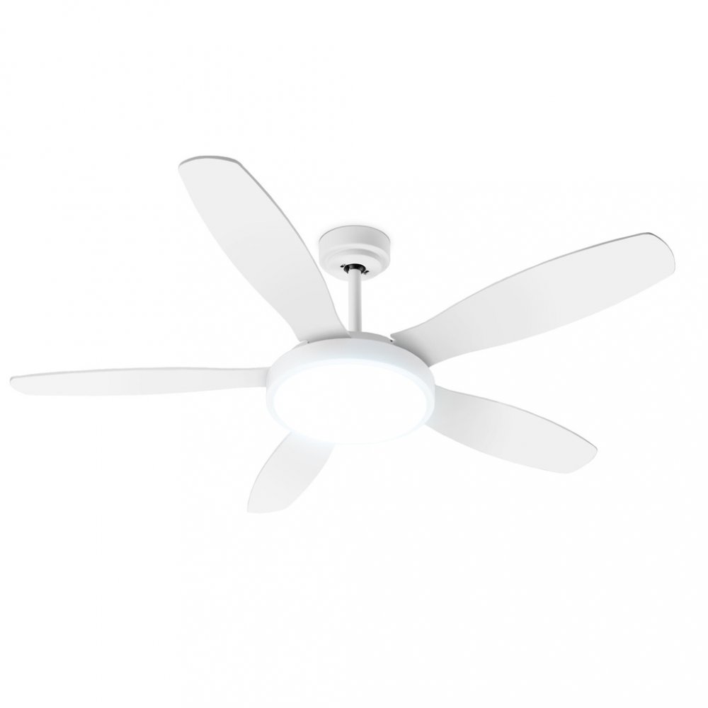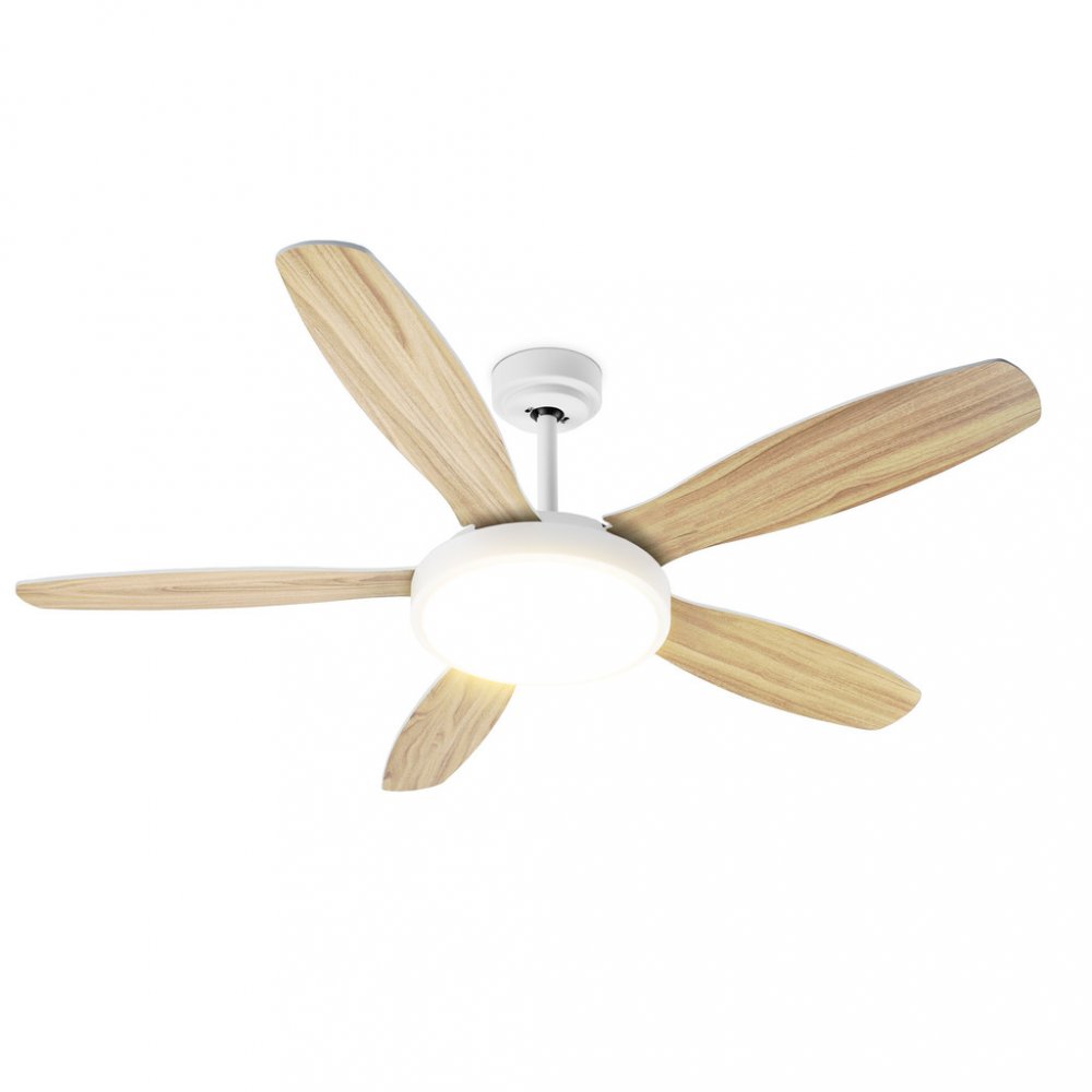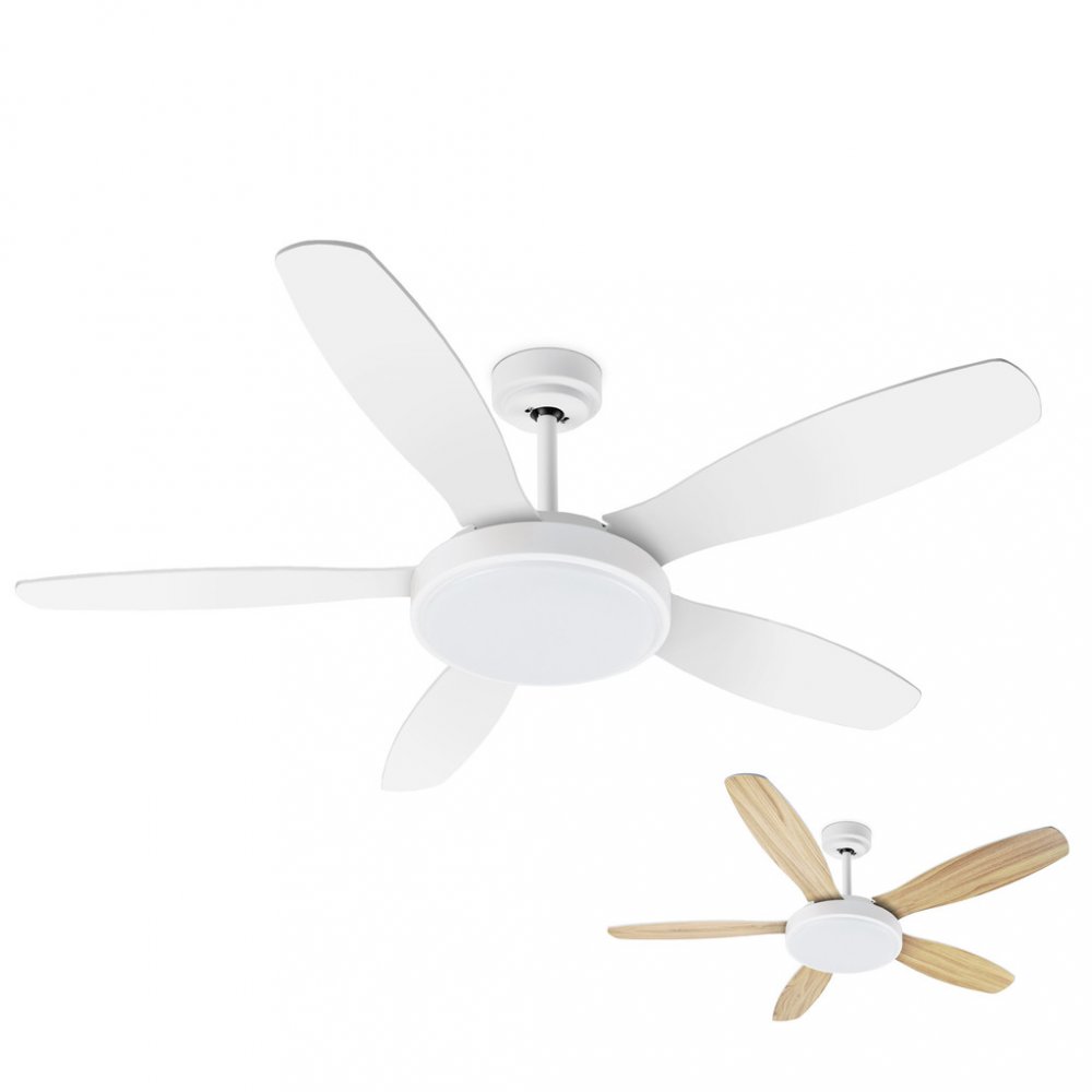 STROPNÍ VENTILÁTOR SE SVĚTLEM MAIA Tento stropní ventilátor s oboustrannými lopatkami (bílá/maia) má integrované LED světlo. Zajišťuje nejen účinné větrání, ale také osvětlení místnosti. Díky průměru 132 cm a pěti lopatkám má tento ventilátor průtok vzduchu 99 až 198 m3/min, což zajišťuje dostatečnou cirkulaci vzduchu v místnosti. Modul LED má maximální výkon 24 W a lze jej přizpůsobit teplotě svě...