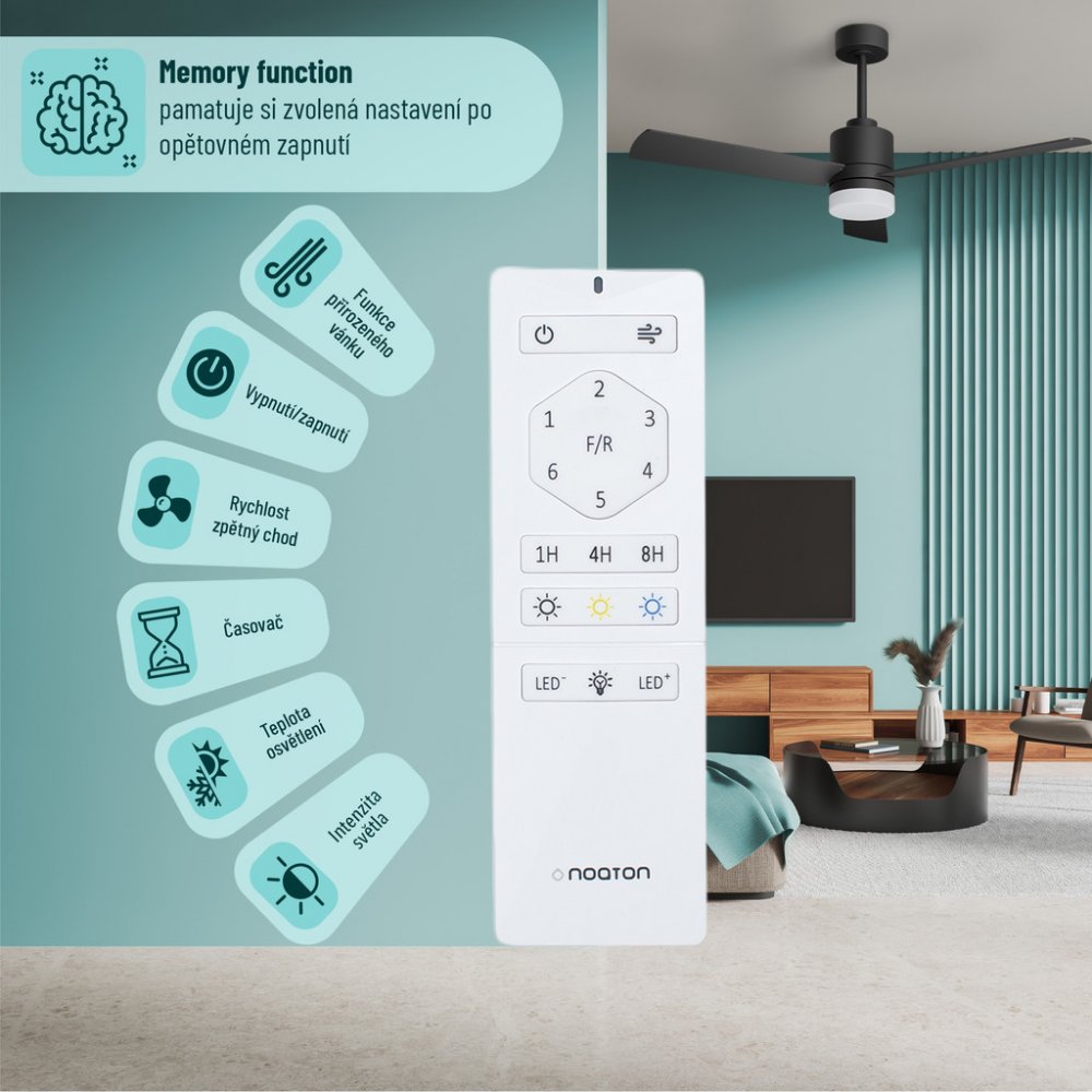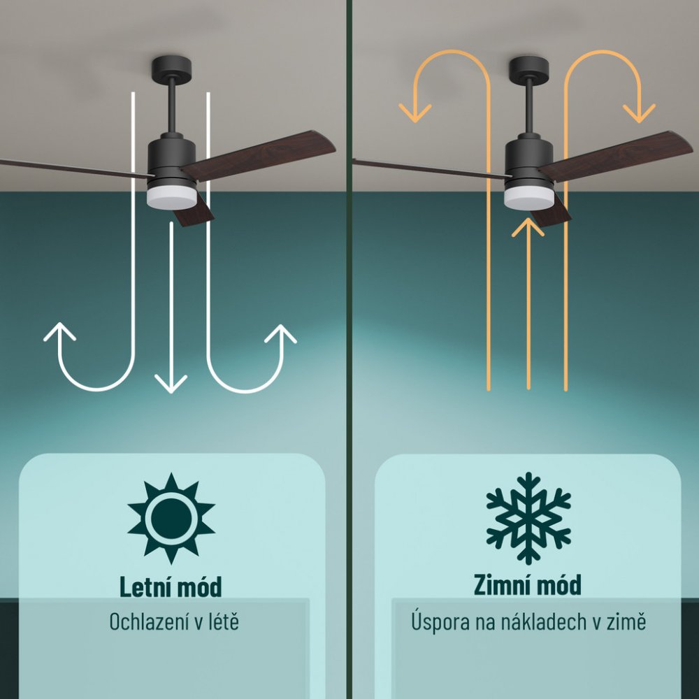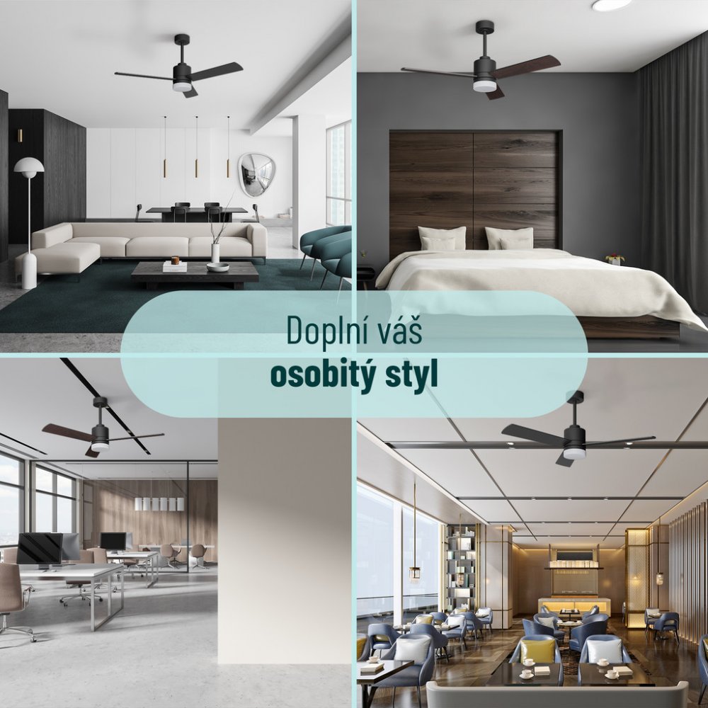 Velký stropní ventilátor se světlem, který nejen rozproudí vzduch v místnosti, ale zároveň ji celou osvítí. Díky univerzální černé a tmavě hnědé barvě se přístroj hodí téměř všude. Možnost využití 6 rychlostních stupňů, maximální spotřeba energie je 35 W.