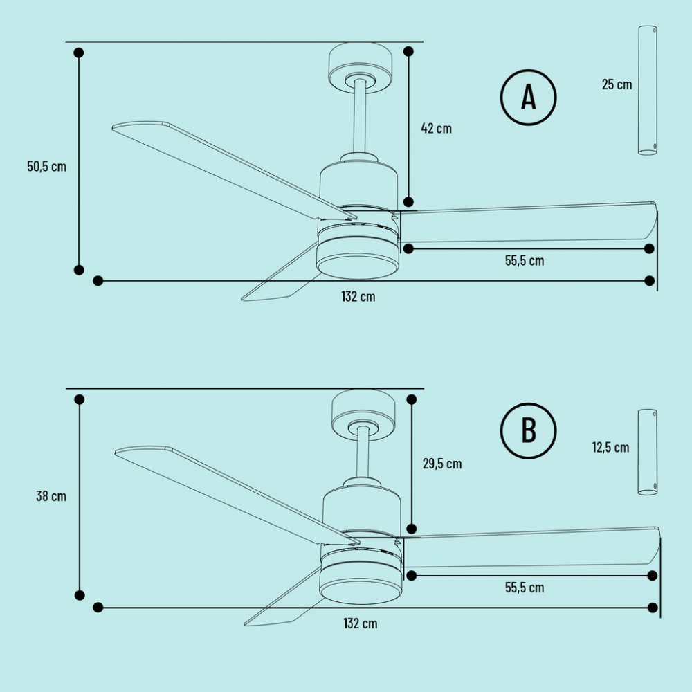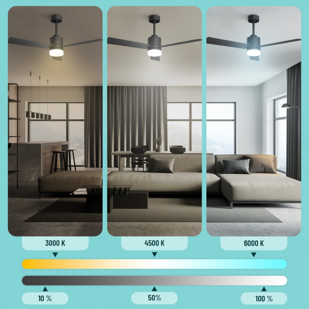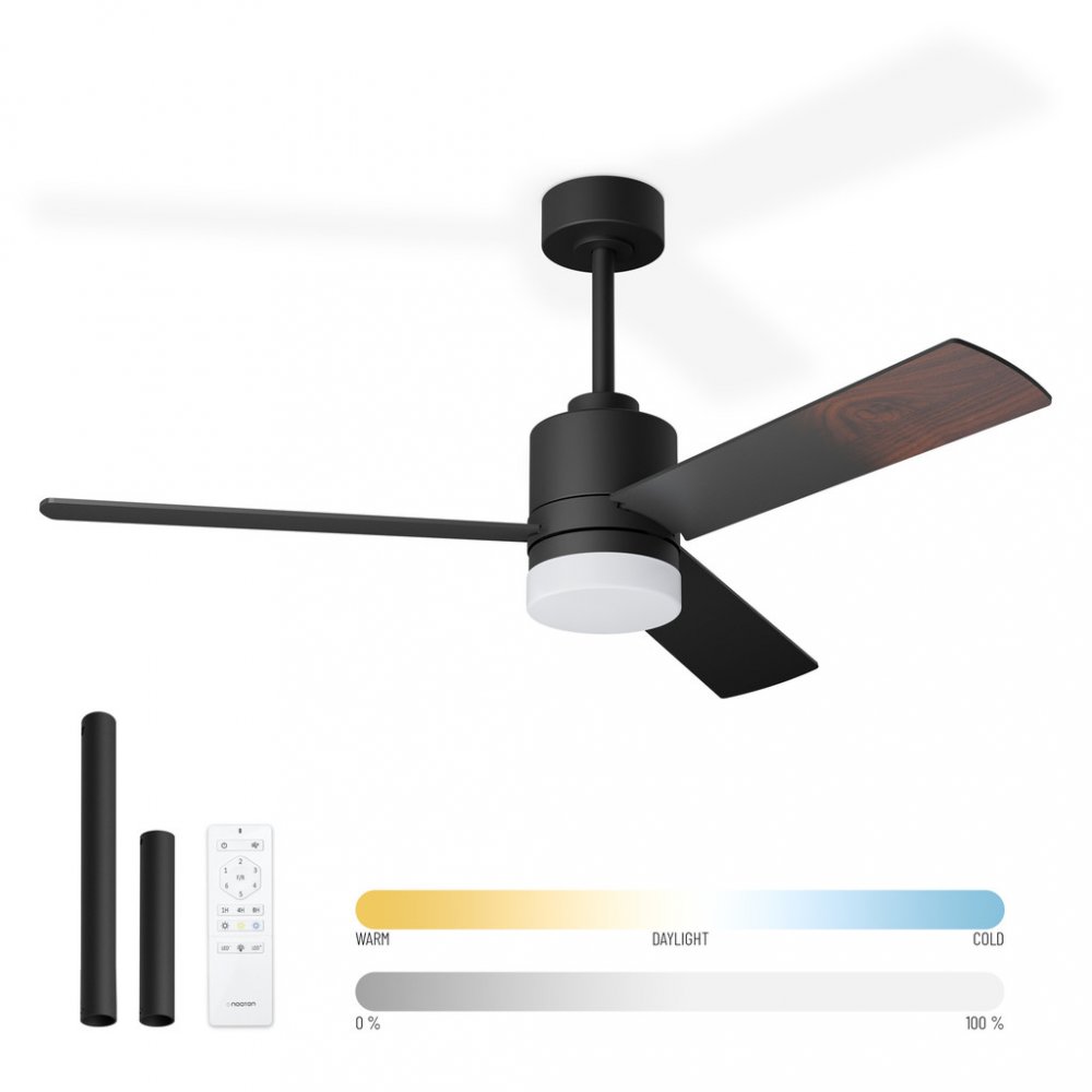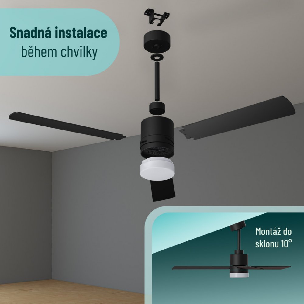 Velký stropní ventilátor se světlem, který nejen rozproudí vzduch v místnosti, ale zároveň ji celou osvítí. Díky univerzální černé a tmavě hnědé barvě se přístroj hodí téměř všude. Možnost využití 6 rychlostních stupňů, maximální spotřeba energie je 35 W.