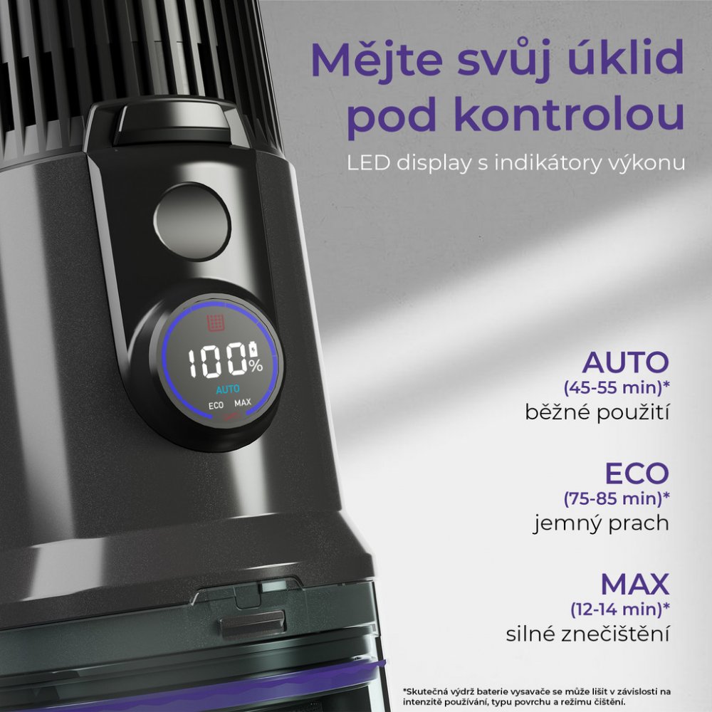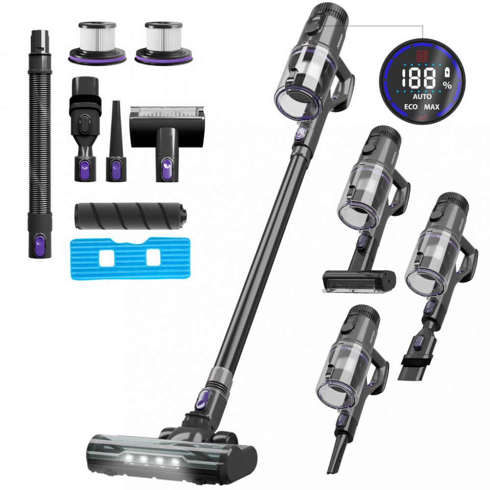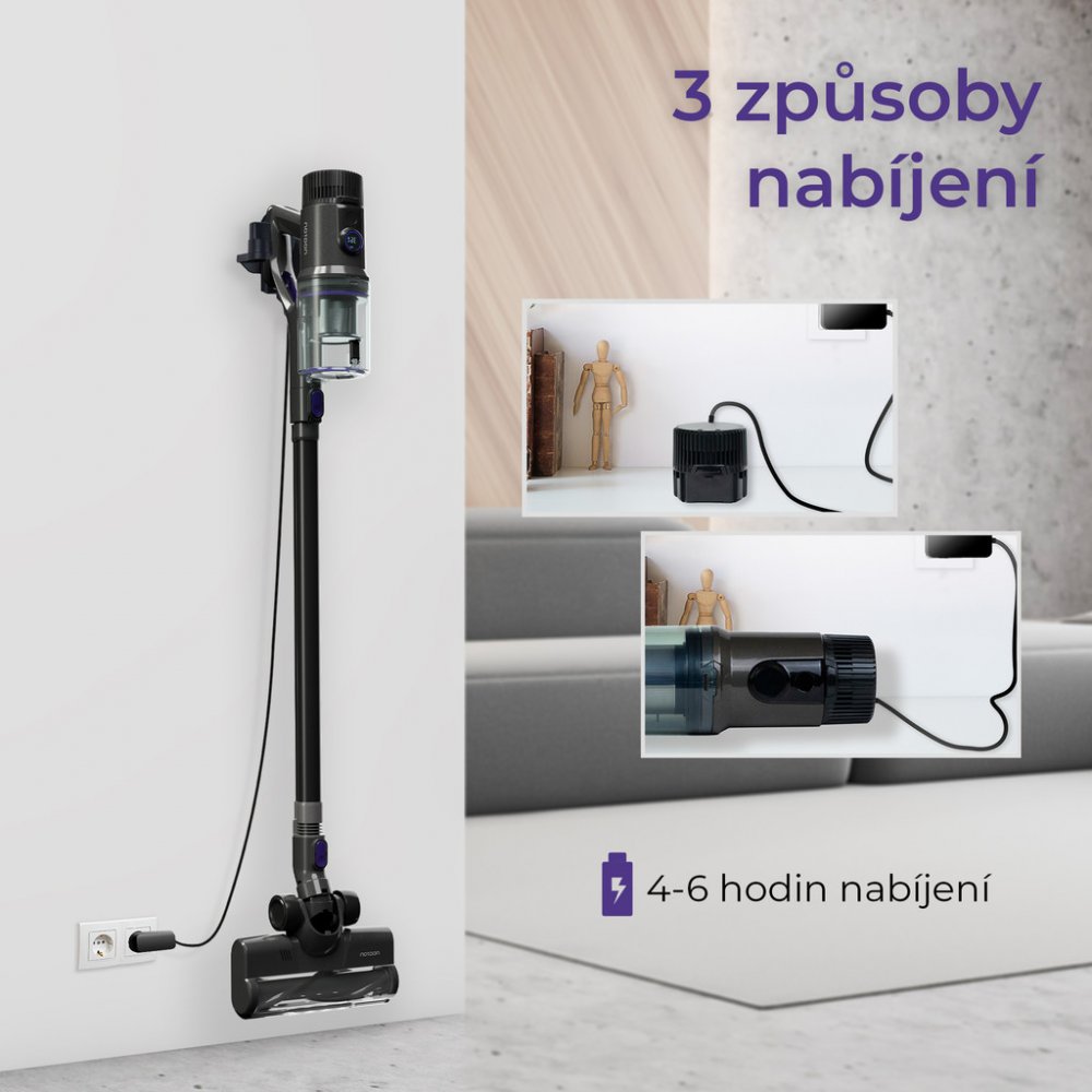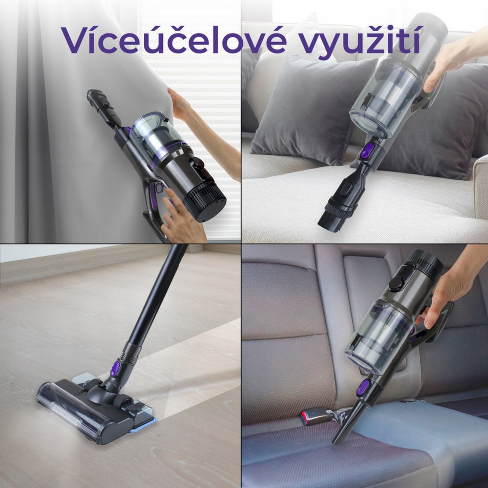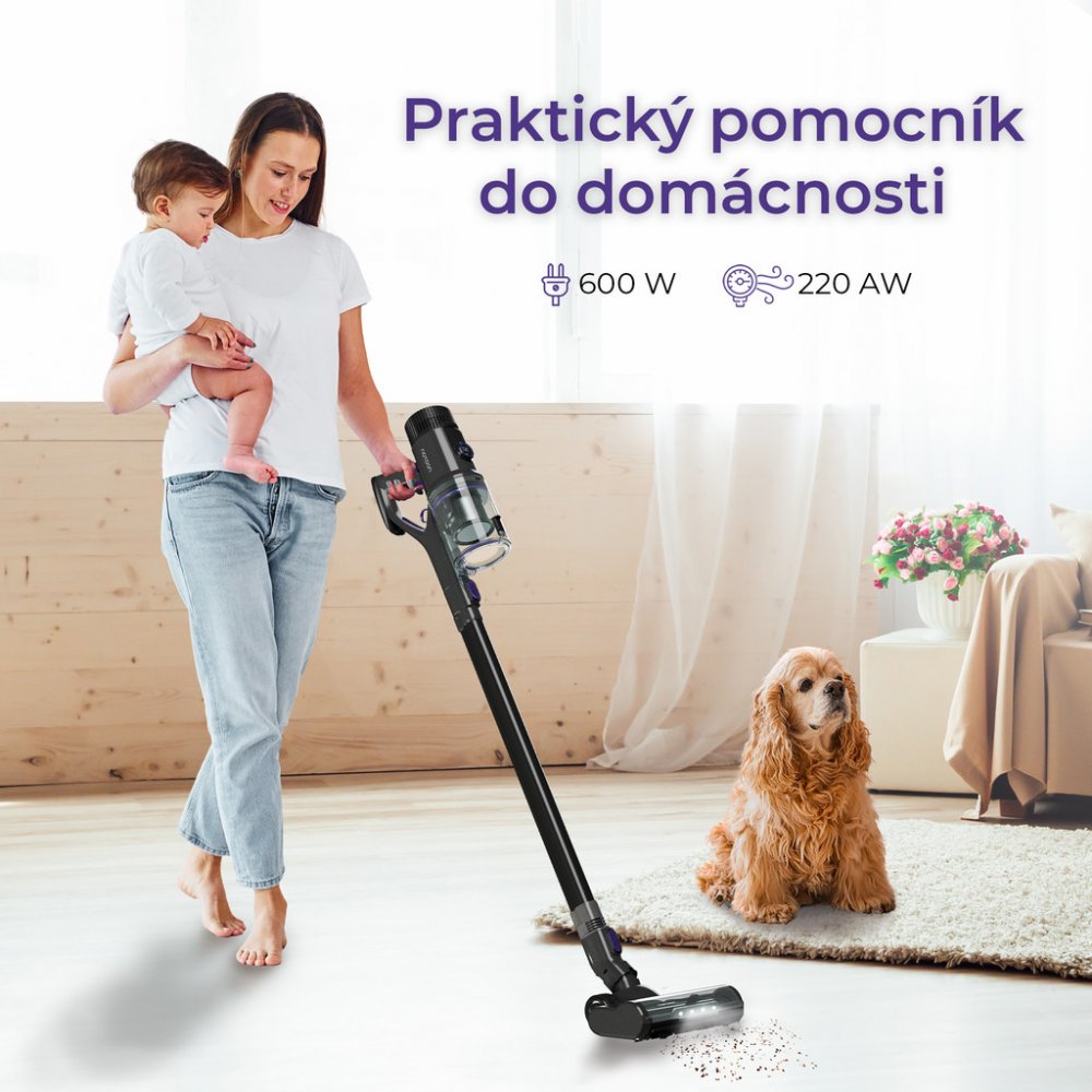 Tyčový vysavač - aku, na všechny druhy podlah, pro alergiky, na zvířecí chlupy a antibakteriální, na suché čištění, na vysávání, na Li-ion baterie, doba provozu 85 min, doba nabíjení 6 h, HEPA filtr a omyvatelný filtr, příkon 600 W, hlučnost 78 dB, plastová sběrná nádoba o objemu 0,7 l, ovládání na těle, LED kontrolka nastaveného stupně výkonu, LED kontrolky stavu nabití baterie a LED osvětlení, s hadicí, hmotnost 2,8 kg, držák na zeď, filtr a mopovací nástavec součástí balení, černá, fialová a šedá barva