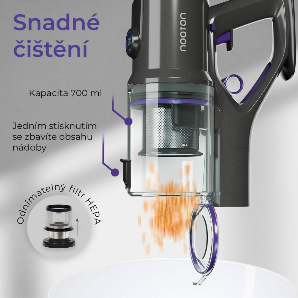Tyčový vysavač Noaton se skvěle hodí pro běžný úklid celého domu nebo bytu. Jednoduše se vypořádá s nejrůznějšími typy povrchů. Zanechá vyčištěný prostor bez bakterií, které se rády množí a neprospívají lidskému organismu. Bez zaváhání odstraní i chlupy vašich zvířecích přátel. Díky účinné filtraci je vhodným pomocníkem pro rodiny s alergiky. Jeho maximální hlučnost je 78 dB, což je srovnatelné s hlasitostí rušné ulice. Designové provedení umocňuje černá, fialová a šedá barva.