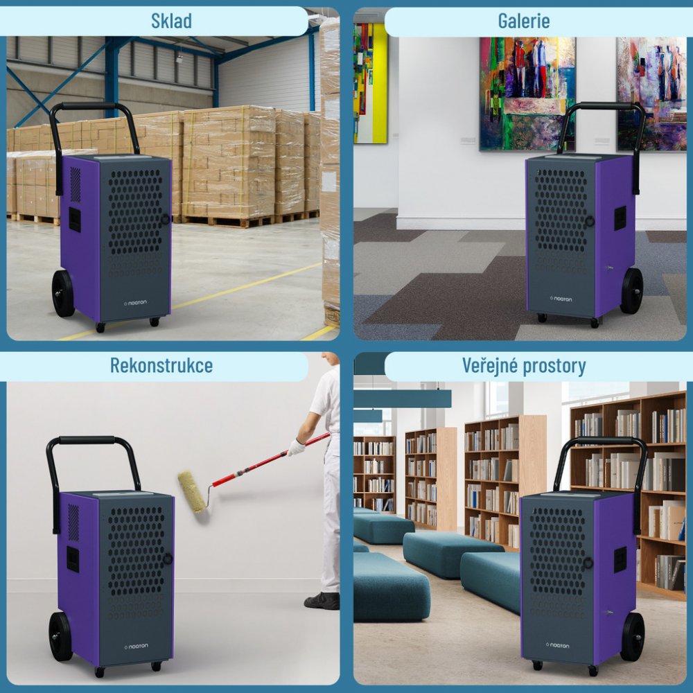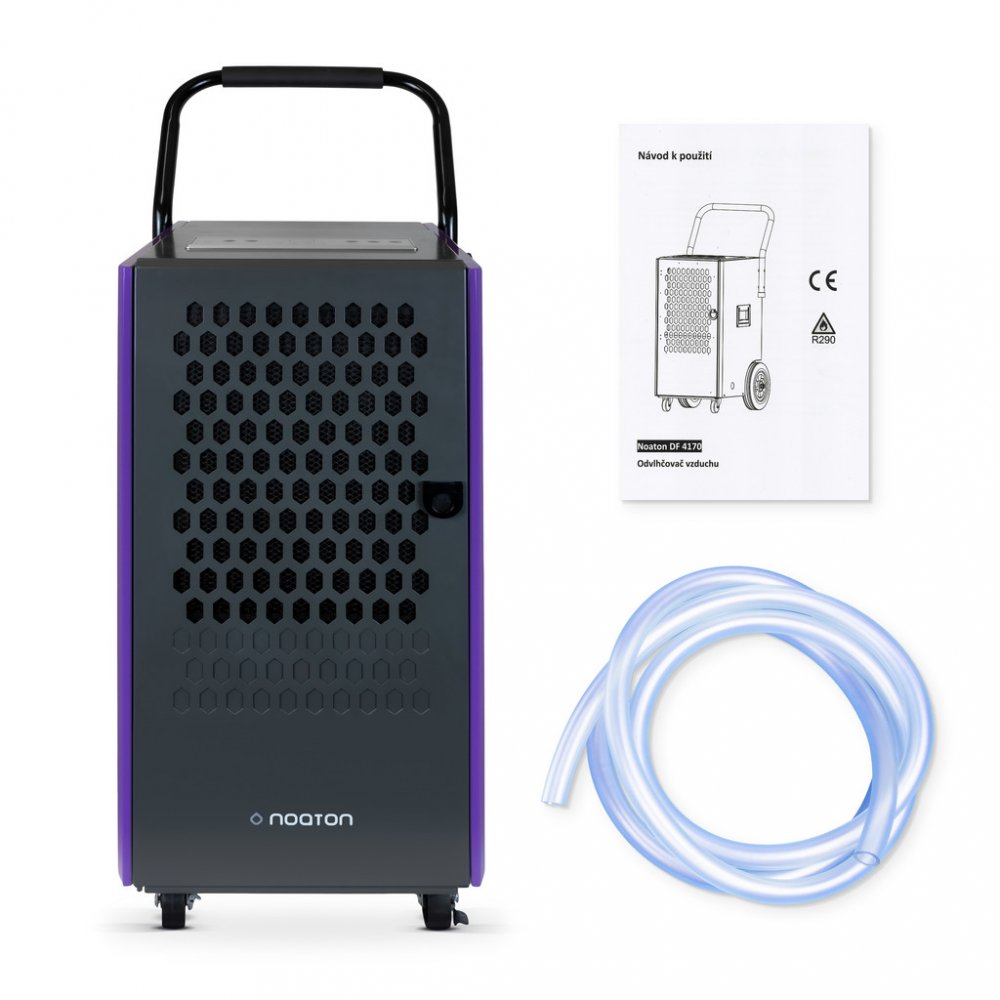 Profesionální odvlhčovač vzduchu Noaton DF 4170Potřebujete spolehlivý přístroj, který dokáže pracovat i v těch nejnáročnějšíchpodmínkách? Profesionální odvlhčovač Noaton DF 4170 je vyroben z odolné ocelové konstrukce a navržen tak, aby bez problémů zvládal dlouhodobý provoz i v prostředí, kde ostatní technika často selhává, a tak se perfektně hodí do prostorů, které si žádají 100% spolehlivá řešení.Noaton DF4170 pracuje na kompresorové technologii a zaručí vám tak účinnost odvlhčování až 70 l za 24 hodin(při 30℃, 80 % RV) a jeho spotřeba energie je maximálně 759 W (při 27 °C a RV 60%). V praxi se tento průmyslový odvlhčovač nejčastěji používá při vysoušení vlhkého zdiva tam, kde hrozí problémy vzniku plísně nebo jiných problémů způsobených vysokou vlhkostí v prostorech, jako jsou stavby, galerie, suterény, průmyslové haly, sklady a další místnosti s minimální velikostí 13 m2.V případě stavebních činností navíc ušetříte čas i námahu – zdi rychleji vyschnou a můžete tak mnohem dříve zahájit další práce, jako je omítání nebo malování.Flexibilní odvlhčováníVyberte si mezi dvěma možnostmi používání našeho odvlhčovače Noaton DF 4170. První možností je nádržka o velikosti 5,5L, kterou při jejím naplnění jednoduše vyprázdníte a můžete pokračovat v odvlhčování - v případě naplnění nádrže dojde k automatickému vypnutí přístroje. Pokud preferujete nepřetržitý chod, jistě oceníte možnost kontinuální odtoku pomocí přiložené hadice, díky které můžete nechat odvlhčovač pracovat po vámi požadovanou dobu.CHYTRÉ FUNKCE PRO KAŽDÝ DENMezi užitečné funkce patří například nastavitelný časovač(1-24h)zahrnující odložený start a automatické vypnutí, díky čemuž můžete přístroj nechat běžet nebo opožděně zapnout bez starostí v případech, kdy u něj zrovna nemůžete být. Zařízení je také vybaveno hygrostatem, zajišťující automatické udržováni vlhkosti v rozmezí 20% - 95%. Požadovanou vlhkost jednoduše nastavíte na intuitivním displeji, který vám zobrazí současnou hodnotu vlhkosti v prostoru.PRAKTICKÝ A SNADNO MANIPULOVATELNÝS váhou 40 kg a rozměry 412x510x920 mm (včetně držadla) se může zdát odvlhčovač těžkopádný a složitě manipulovatelný. Nicméně díky jeho promyšlené konstrukci, zahrnující držadlo z oceli, gumových kol a brzdných koleček je manipulace naopak velice pohodlná a jednoduchá. Noaton DF 4170 je navíc vybaven magnetickými dvířky, aby nedocházelo k samovolnému otevírání, a držákem na napájecí kabel.